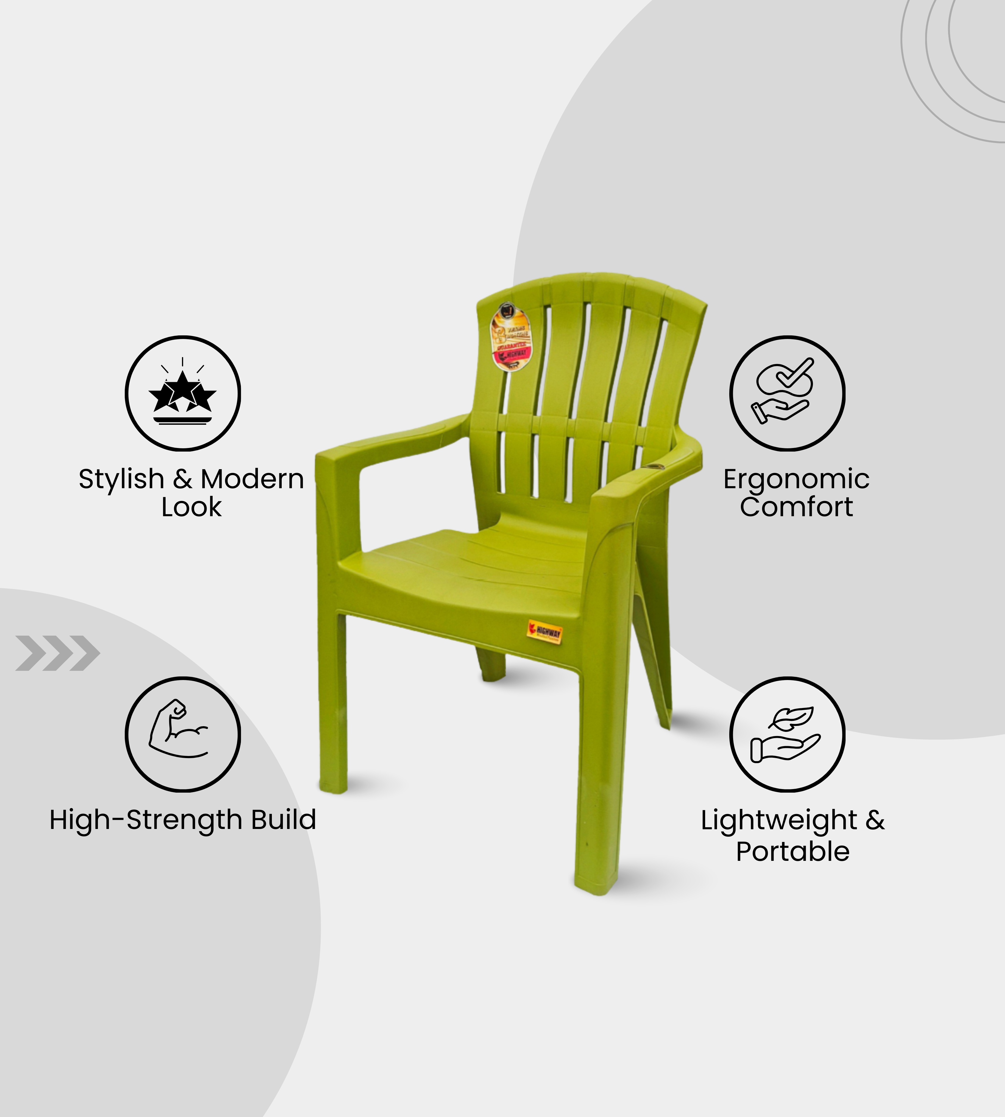 The Highway Matt Finish Armchair is a premium-quality plastic chair designed for comfort, durability, and style. Measuring 33 inches in height with a 21-inch supportive backrest, it provides ergonomic seating suitable for daily use at home, institutions, or commercial spaces.
