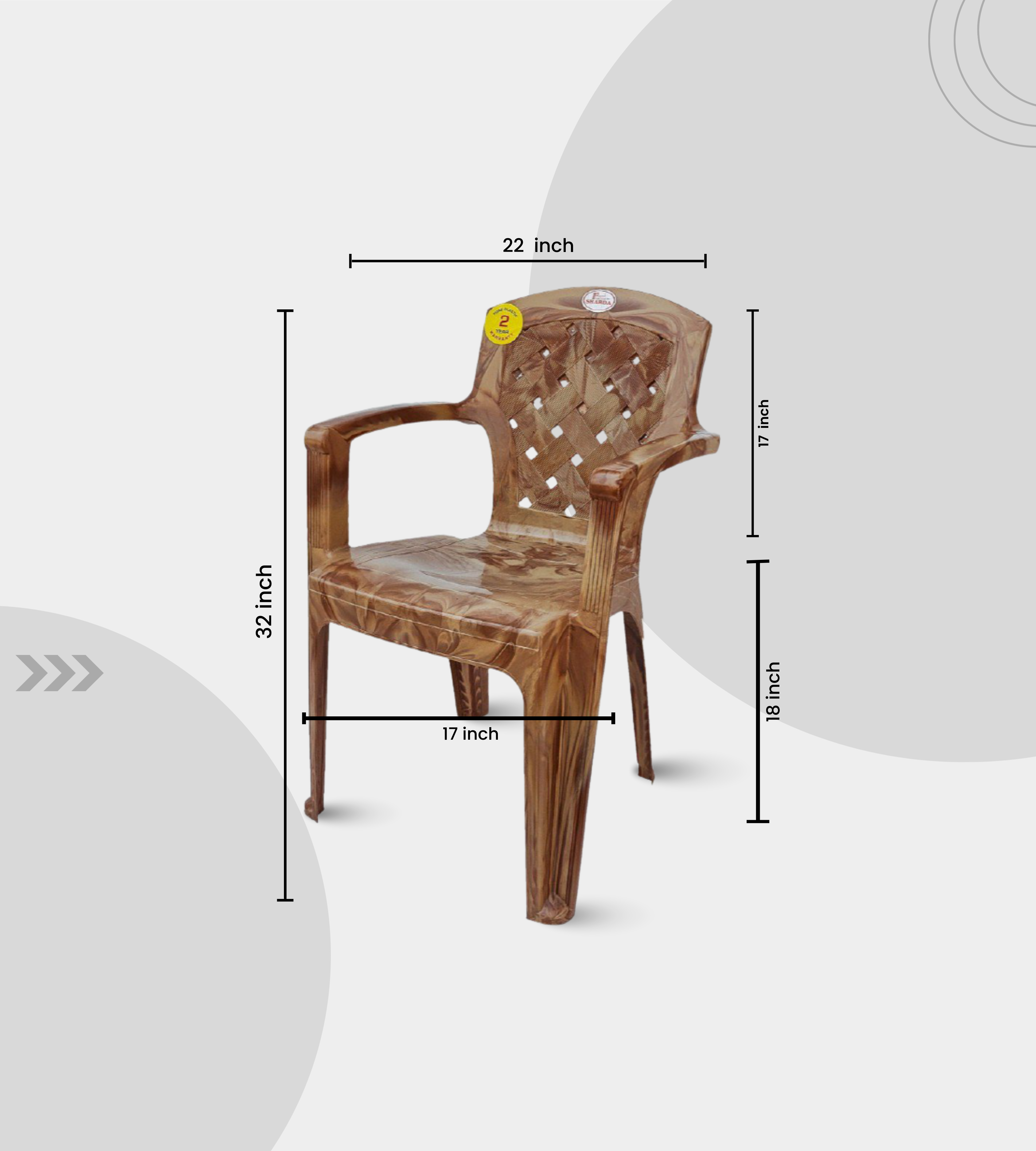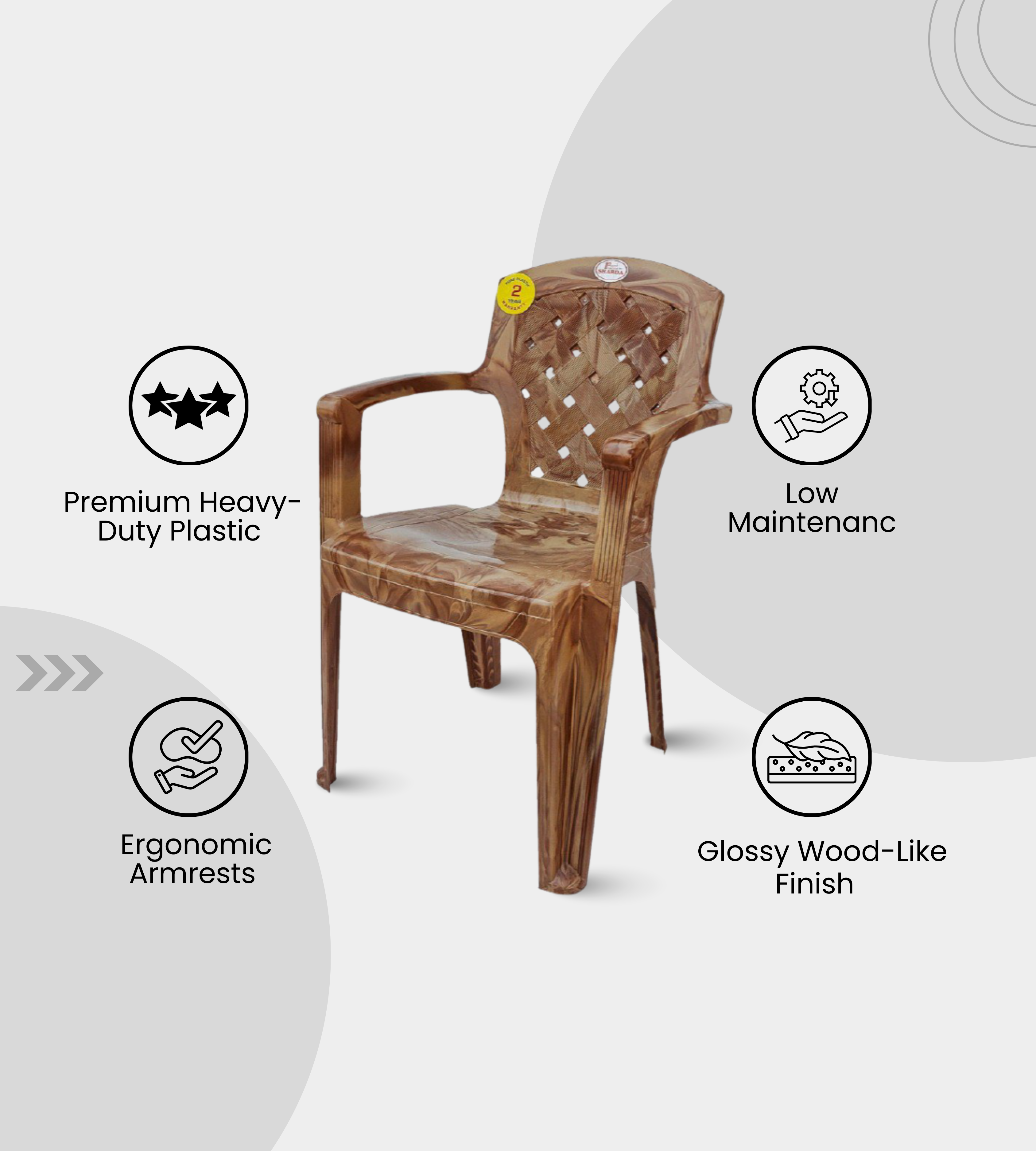 The Sharda Plastic Armchair combines strength, style, and reliability. Crafted from heavy-duty plastic, it is available in Brown, Rosewood, and Black finishes and stands 32 inches tall with an 18-inch seat height.