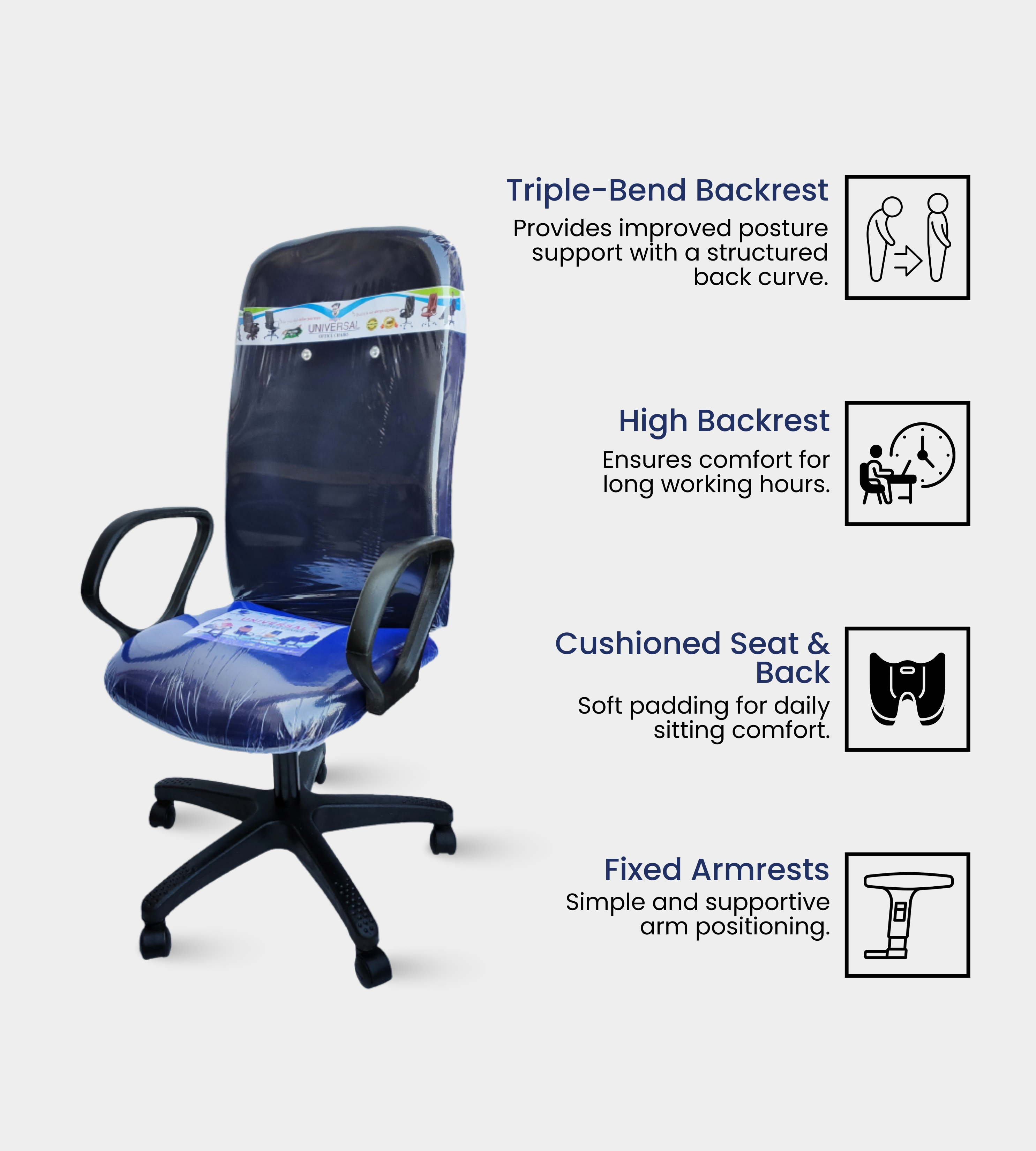 The 3 Bend Plain Chair is a sturdy and versatile seating solution for offices, schools, colleges, libraries, and call centers. Designed with a cloth/rexene seat and backrest, a durable PVC plastic base, and an ergonomic push-back system, it offers long-lasting comfort. Its height adjustability (20–25 inches) and wide availability in all colors make it a stylish and practical choice for both work and study environments.