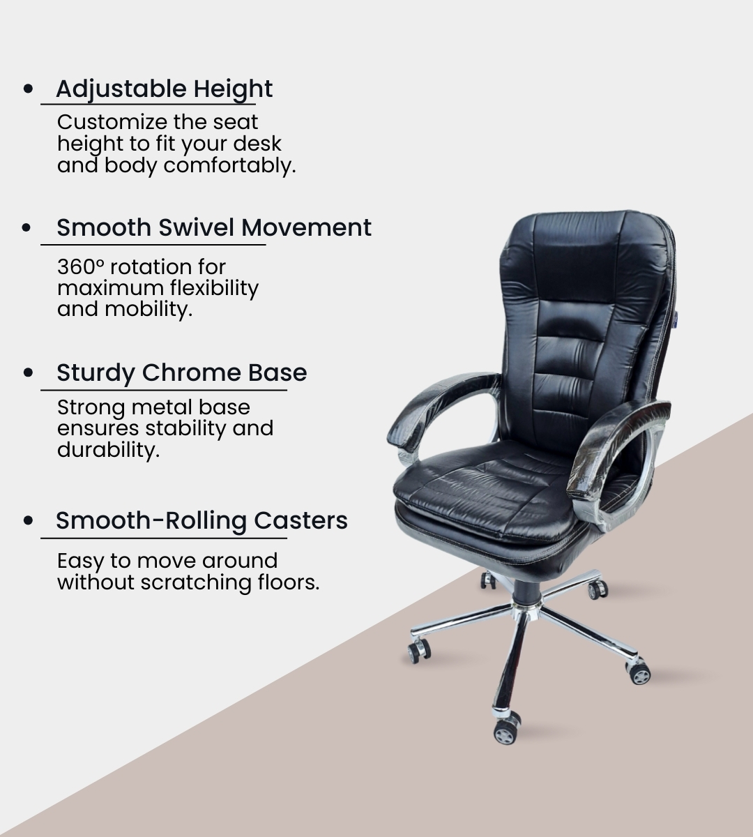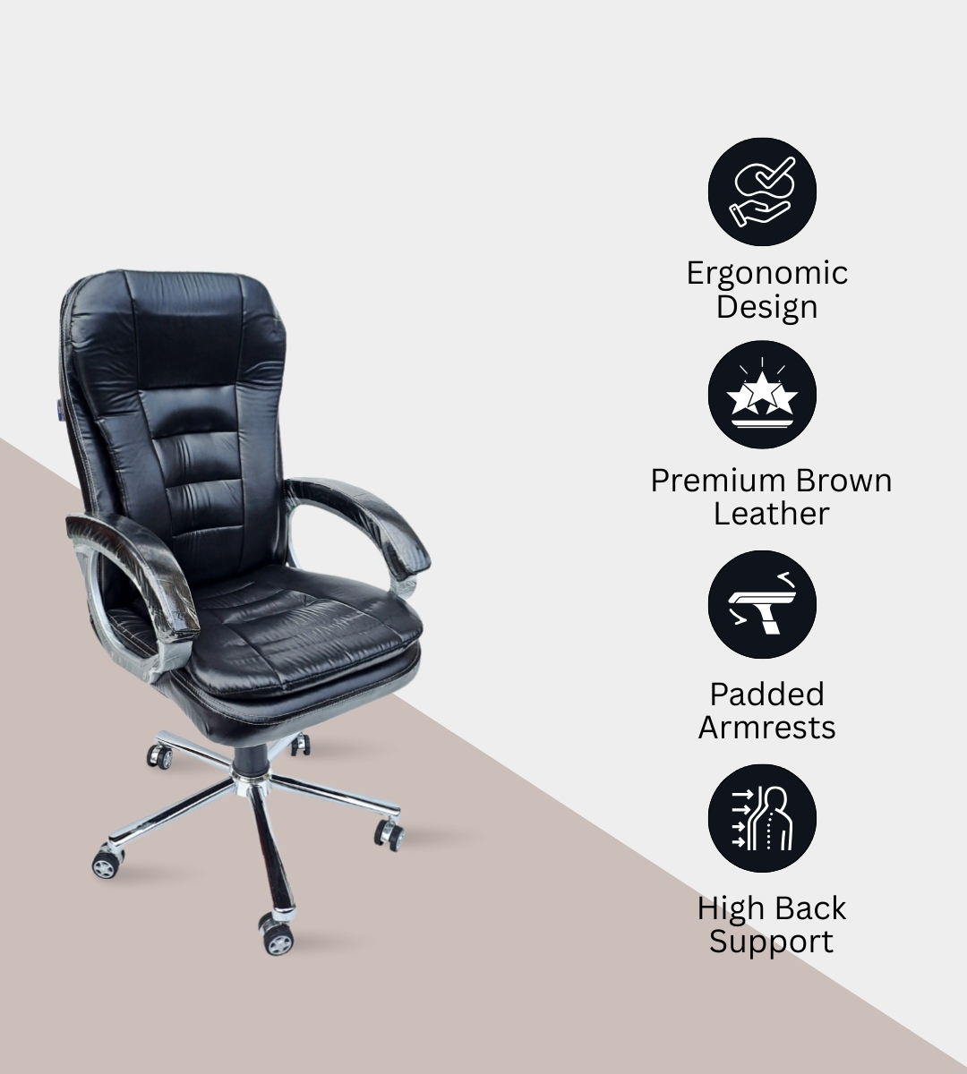 The COBRA High Back Chair is a premium executive seating solution designed for leaders and professionals. Built with an imported steel chrome base and alloy wheels, it ensures durability and smooth mobility. The ergonomic high back structure provides excellent lumbar and upper back support, while the tilting mechanism with lock adds comfort during long working hours. Upholstered with soft rexene and foam-padded rexene handles, this chair blends luxury with function. it complements modern office décor. Ideal for bosses, directors, and executives, the COBRA chair is a signature addition to any premium workspace.