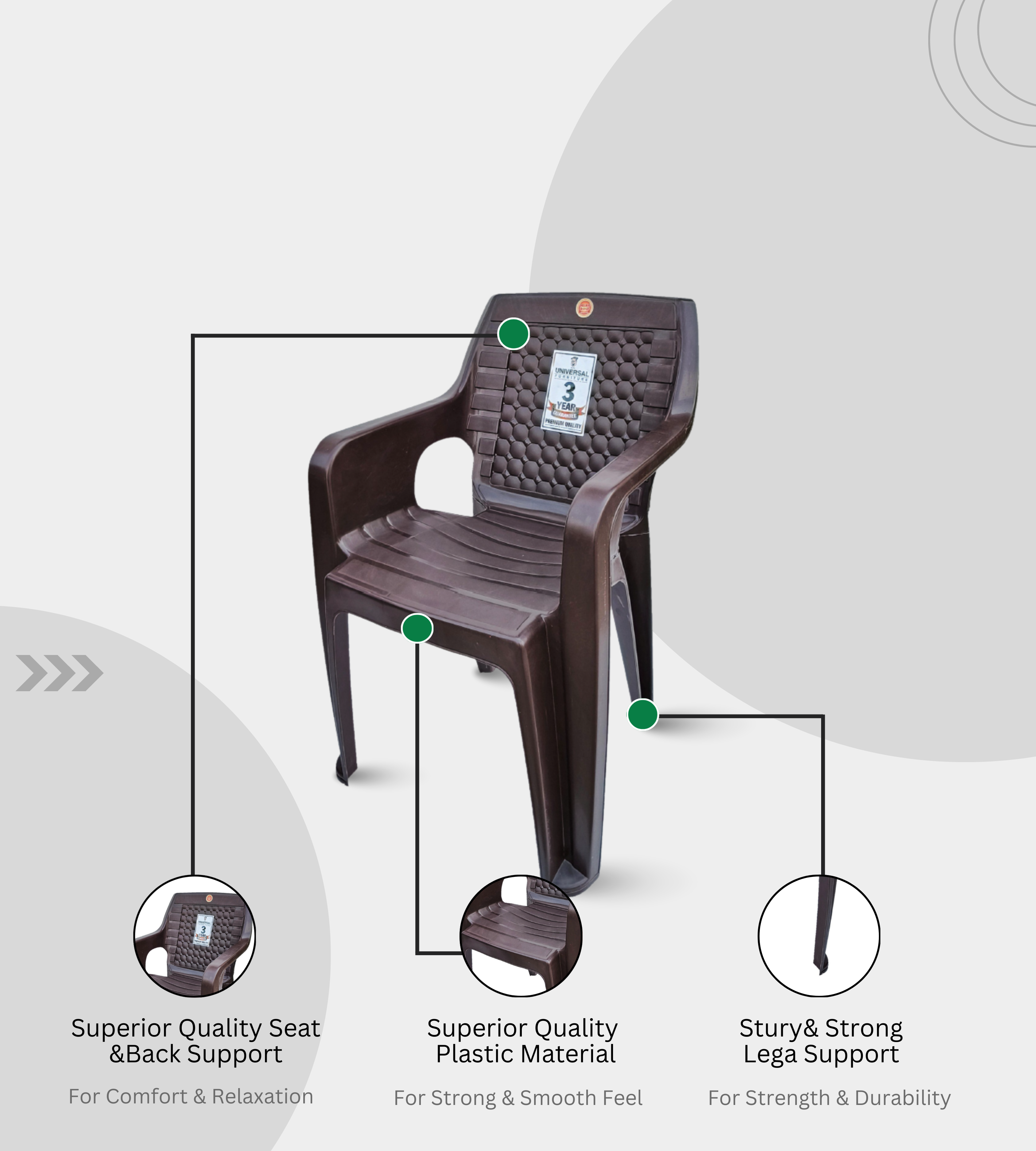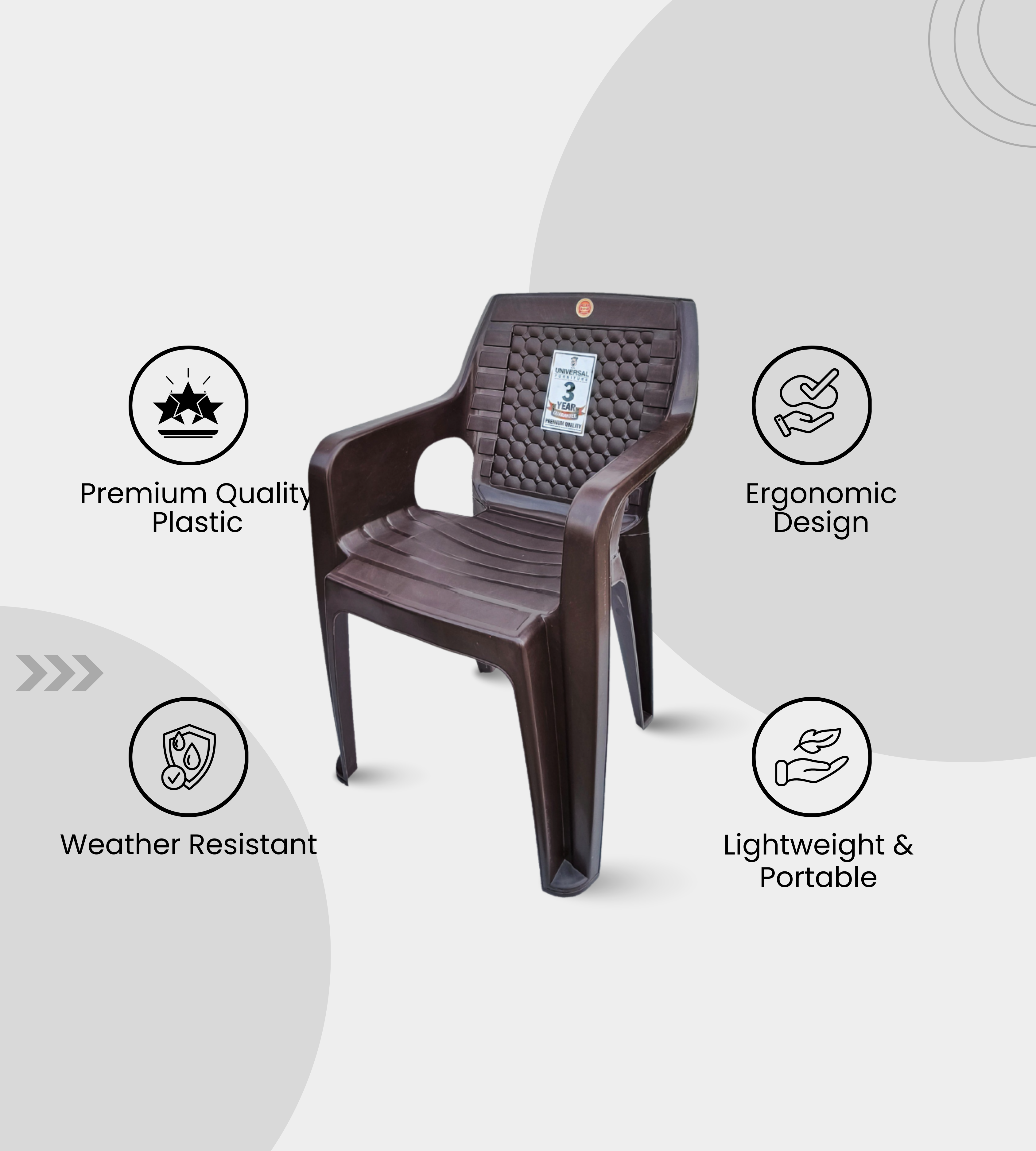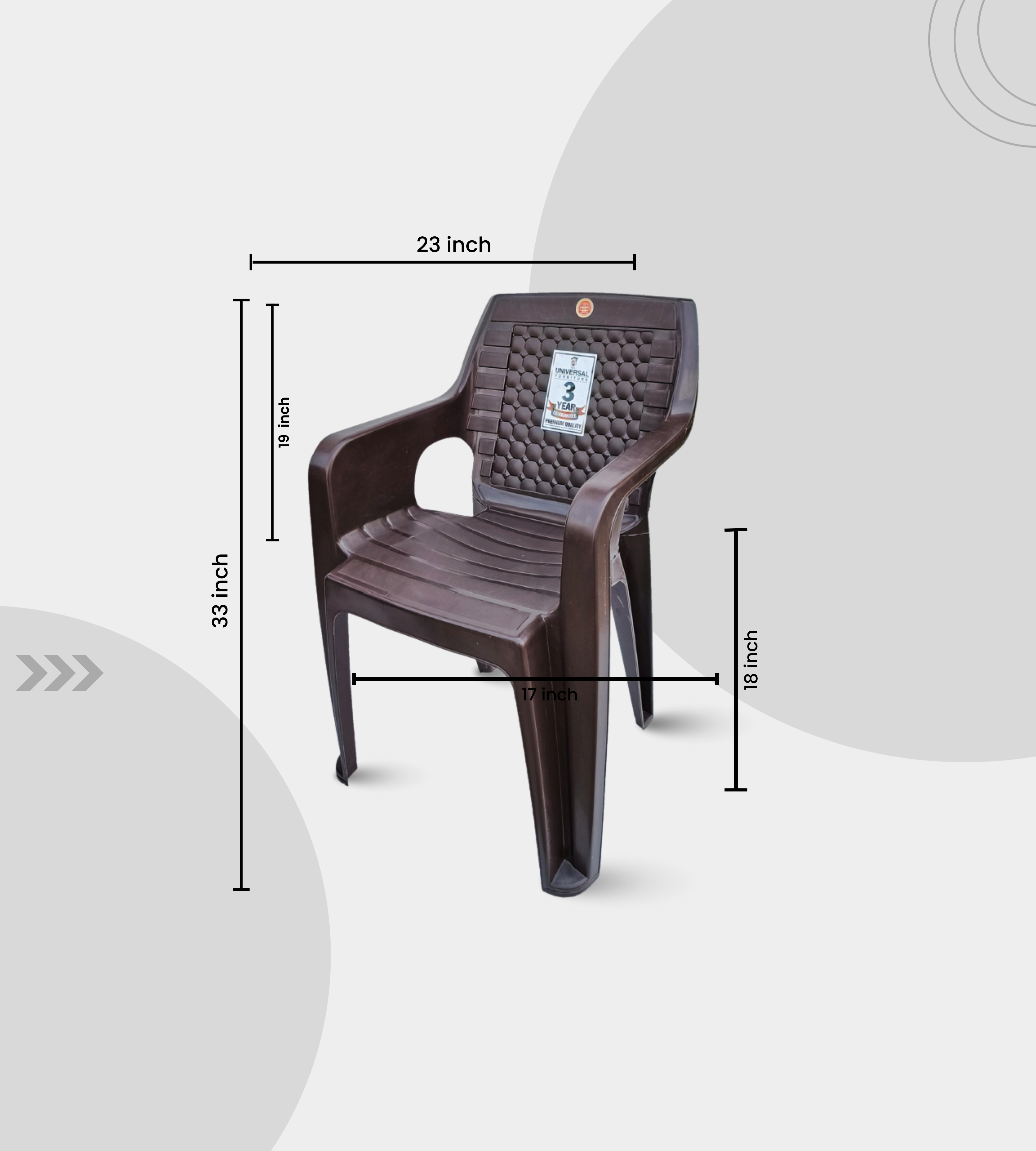 The Prime Gold Diamond Matt Finish chair is a premium armchair crafted from heavy-duty plastic with an elegant diamond-textured matt finish in feather brown. With a total height of 33 inches and an 18-inch seat height, it provides both comfort and durability for long-term use.