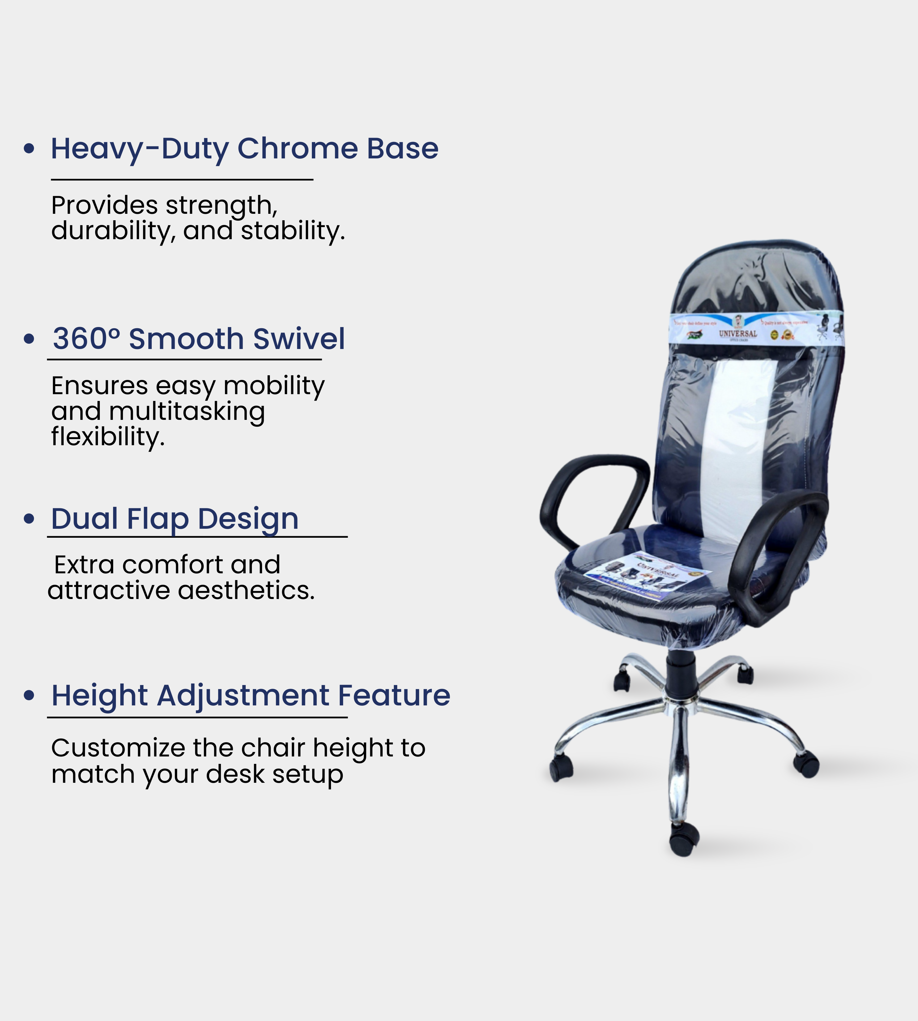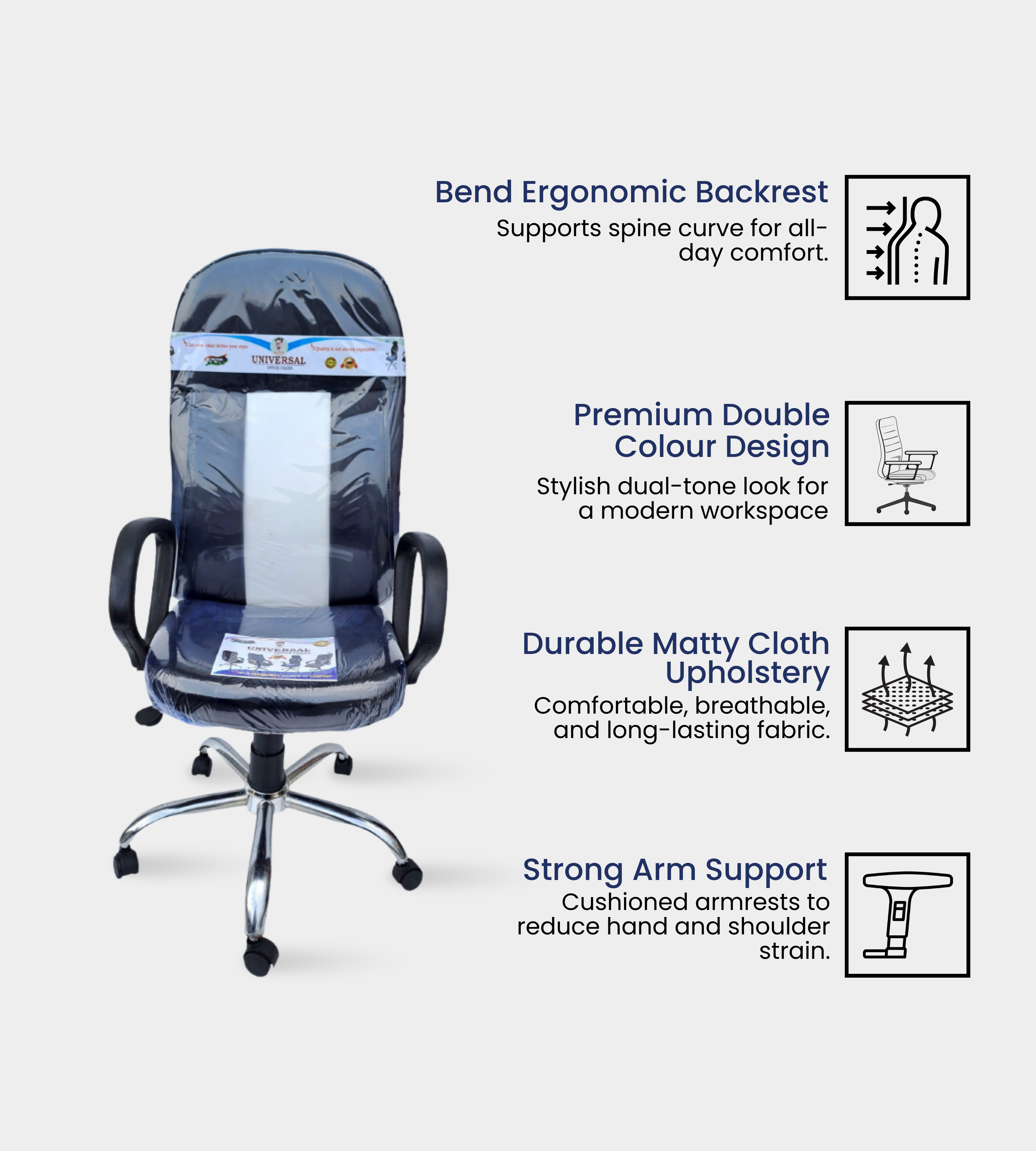 The 3 Bend Chrome Chair is designed to meet the seating needs of schools, colleges, institutions, and office environments, making it suitable for both staff and executive use. Crafted with a balanced structure, it provides comfort and durability for long hours of sitting. The chair is upholstered with premium rexene, offering both elegance and easy maintenance. The supportive backrest and thick cushioned seat ensure a relaxed sitting posture throughout the day. Built on an imported steel chrome base, it provides superior strength and long-lasting stability. Equipped with a push back system and reliable locking mechanism, it offers flexibility for different seating preferences. The soft PU handles provide ergonomic support, while smooth black wheels allow effortless mobility. Available in versatile shades , this chair combines style, comfort, and durability, making it an economical and professional seating solution for everyday use.