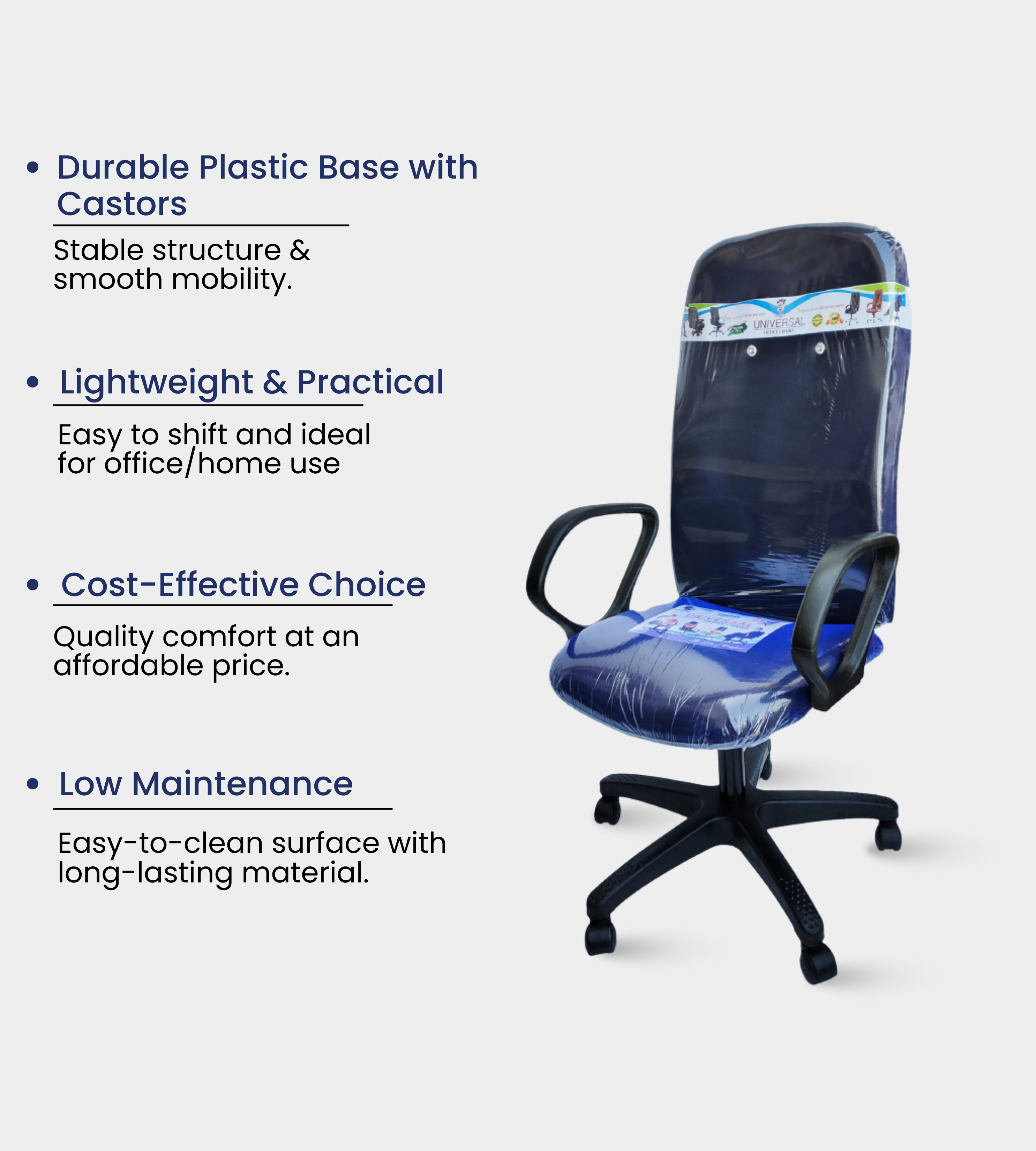 The 3 Bend Plain Chair is a sturdy and versatile seating solution for offices, schools, colleges, libraries, and call centers. Designed with a cloth/rexene seat and backrest, a durable PVC plastic base, and an ergonomic push-back system, it offers long-lasting comfort. Its height adjustability (20–25 inches) and wide availability in all colors make it a stylish and practical choice for both work and study environments.