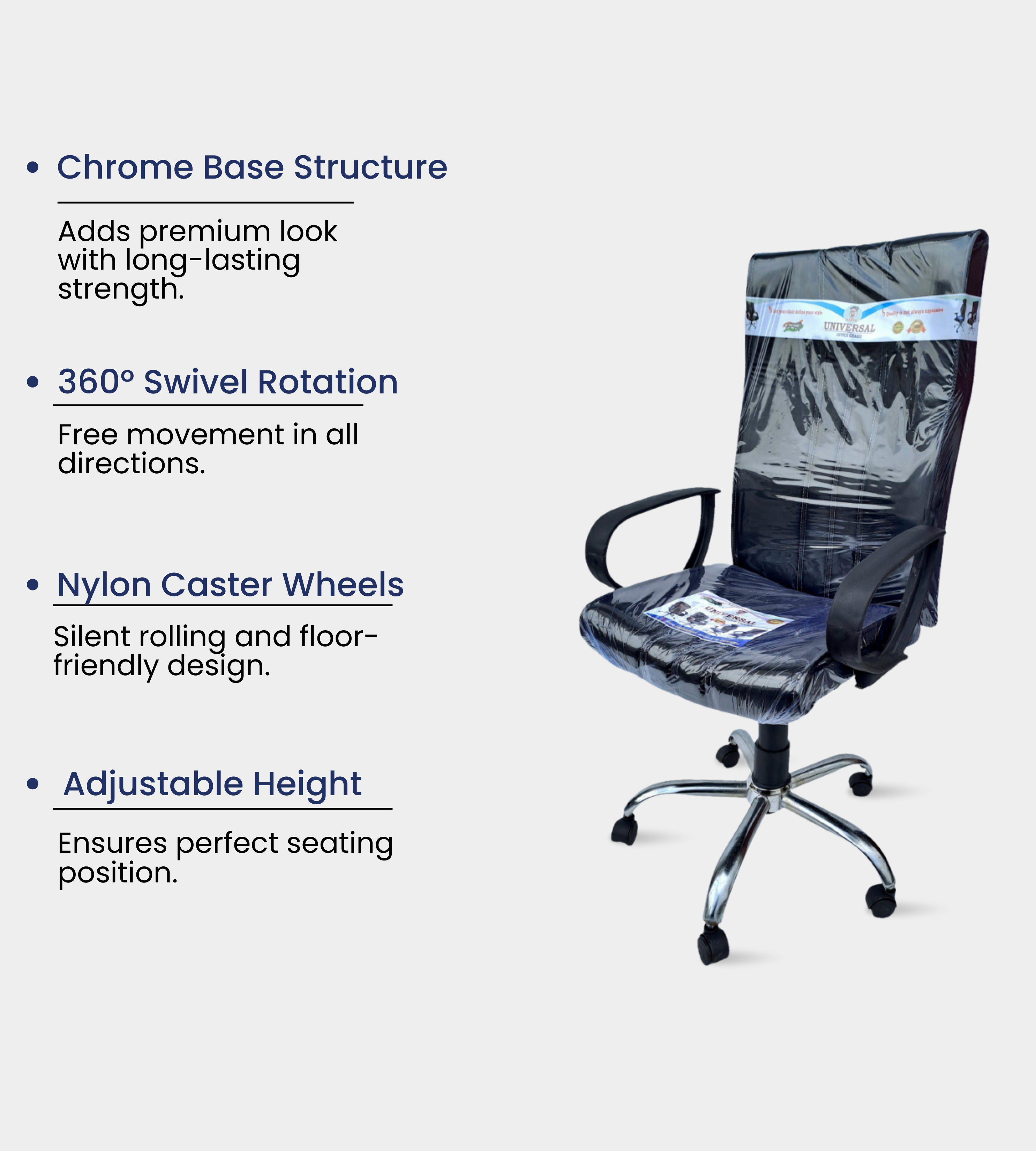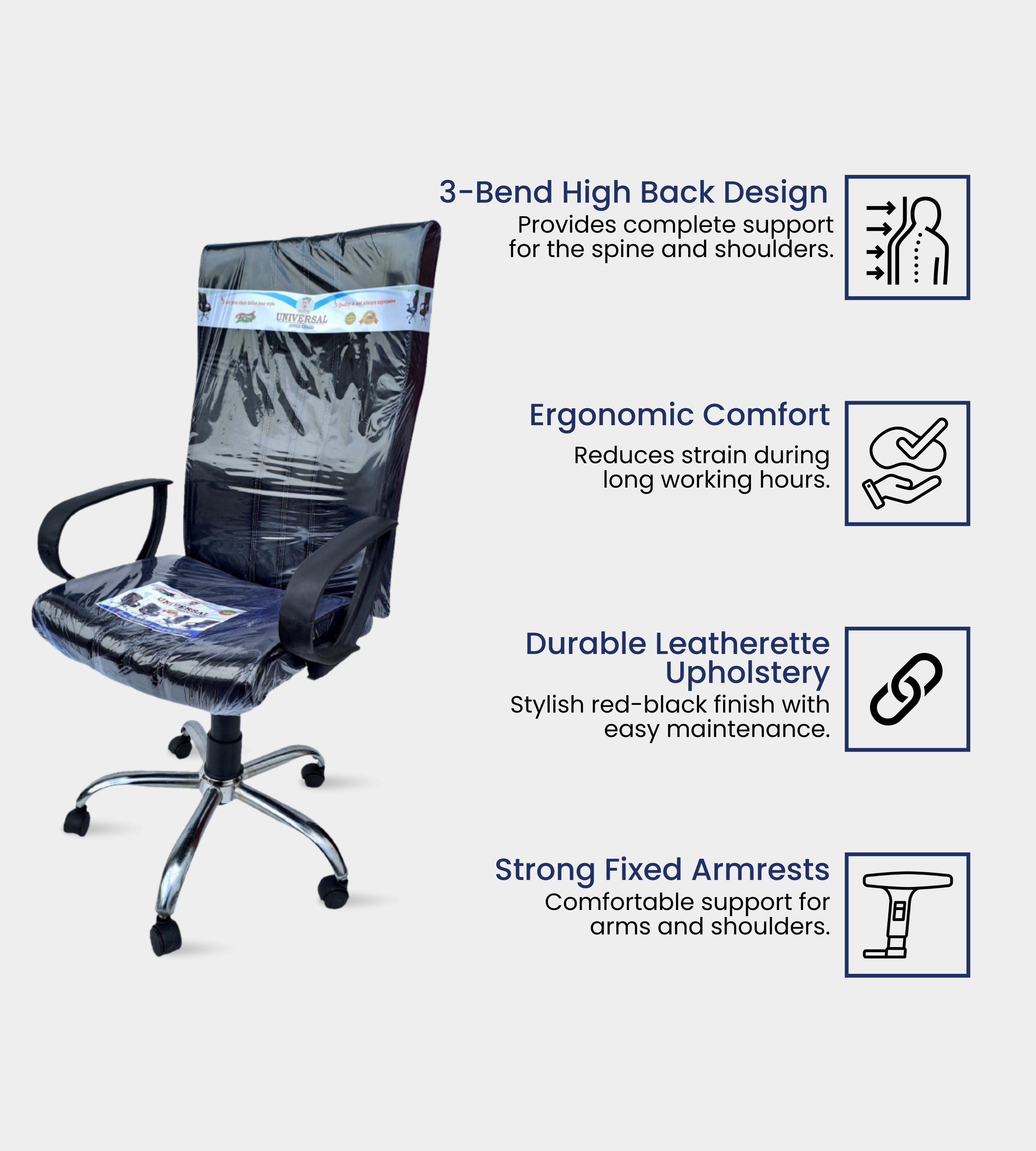 The Three Bend Square Black Chair is a premium office chair designed for long-lasting comfort and style. Upholstered in sleek black rexene, it offers a professional and modern appeal. The chair is built on a durable chrome base with a supportive cushioned seat and ergonomic backrest, ensuring comfort for extended use. Its push-back system provides flexibility, while its robust design makes it ideal for both staff and executives. Whether in offices, colleges, or libraries, this chair is a dependable choice that combines durability, comfort, and sophistication.