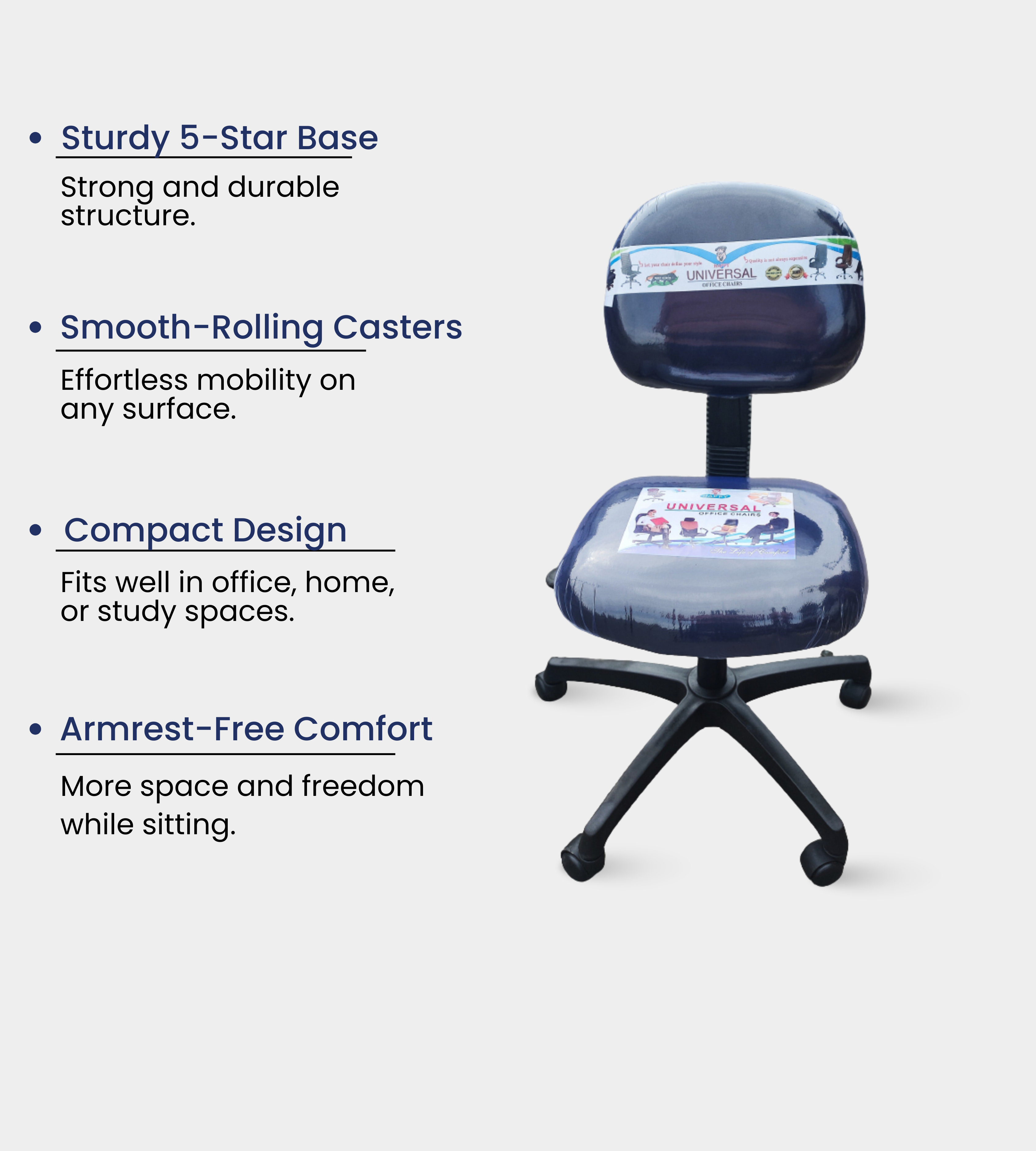 The Computer Chair (Without Handles) is a practical and ergonomic choice for academic and professional environments. Built with a sturdy PVC plastic base and smooth black wheels, it ensures durability and easy mobility.