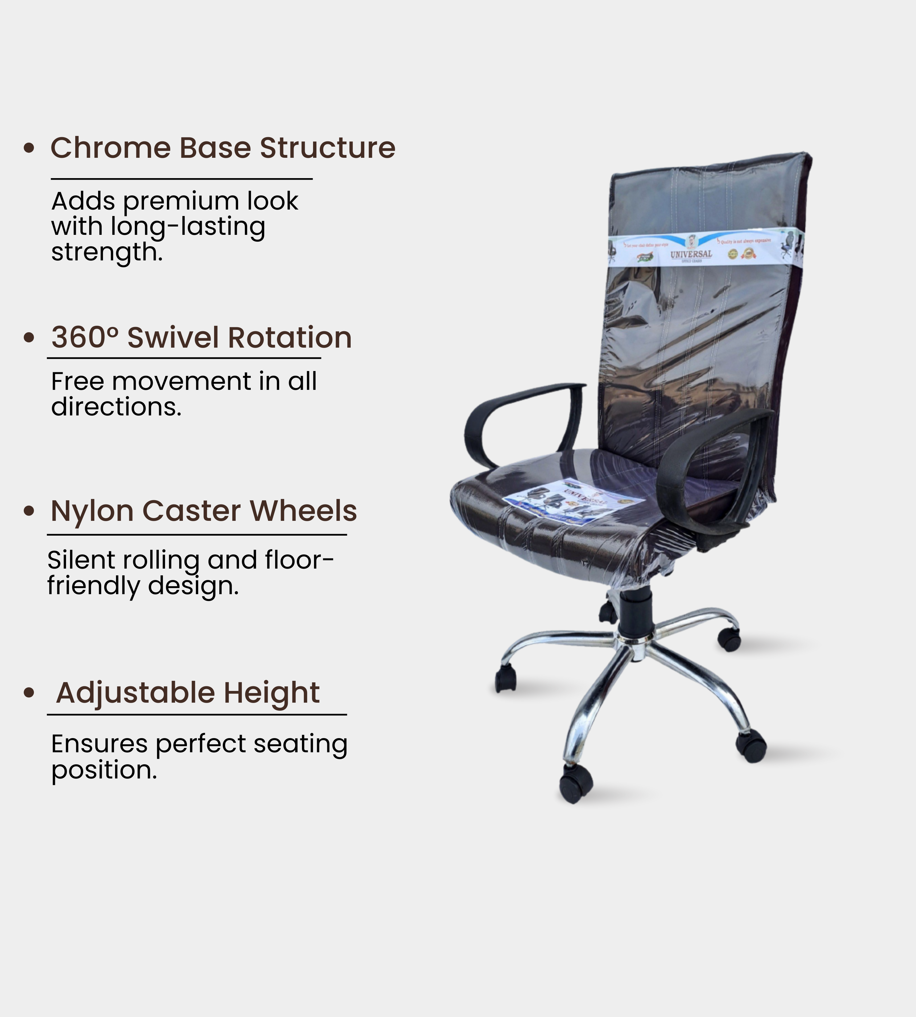 The 3 Bend Square Chair is an executive-class seating solution designed for staff and boss use. Built with a comfortable rexene seat and backrest, it ensures durability and a premium look. The imported steel chrome base provides strength, while the adjustable height (21–26 inches) and push-back system enhance usability. Available with hard or soft handles, this chair combines flexibility with comfort makes it a versatile option for modern offices, institutions, and executive cabins.