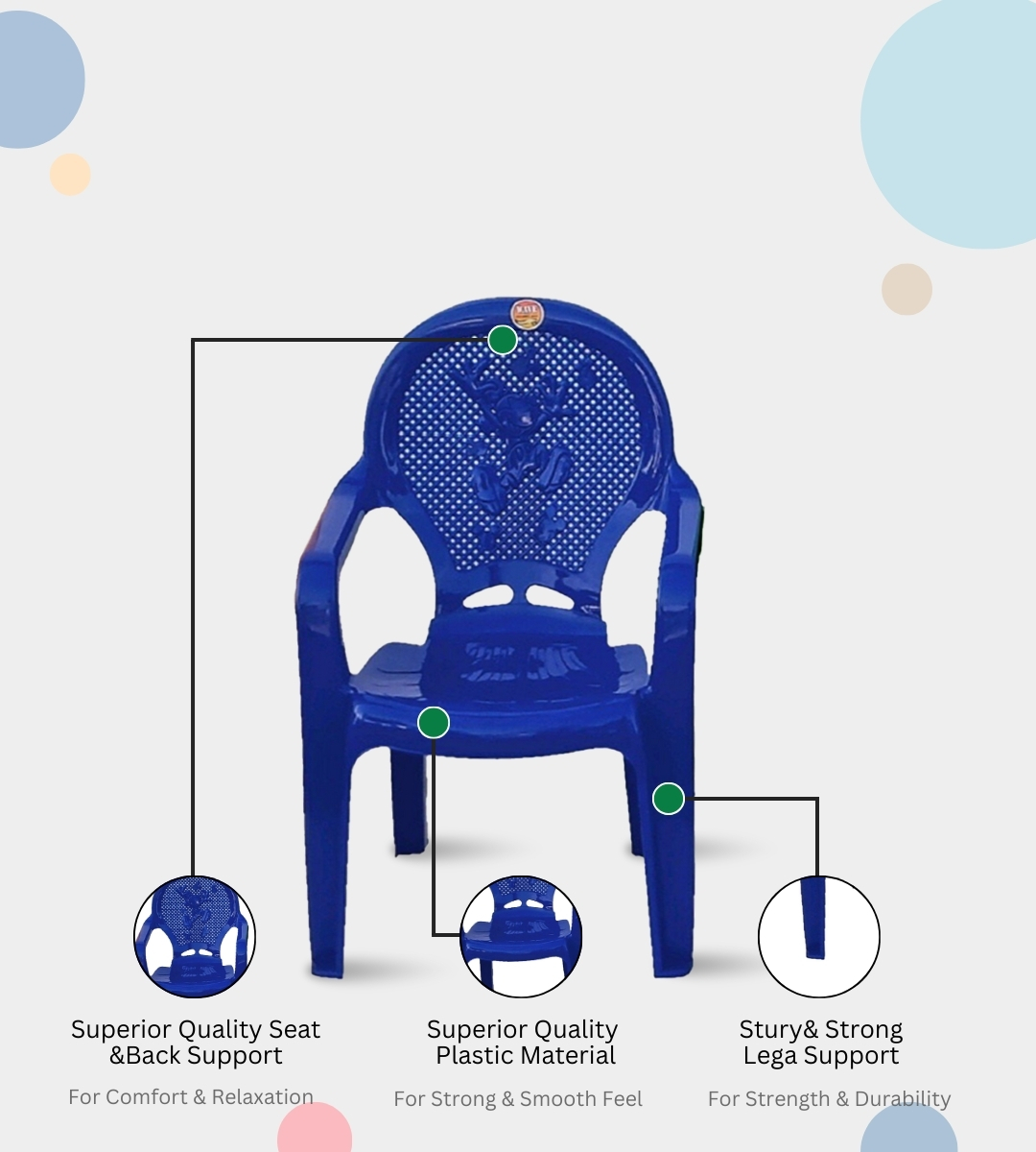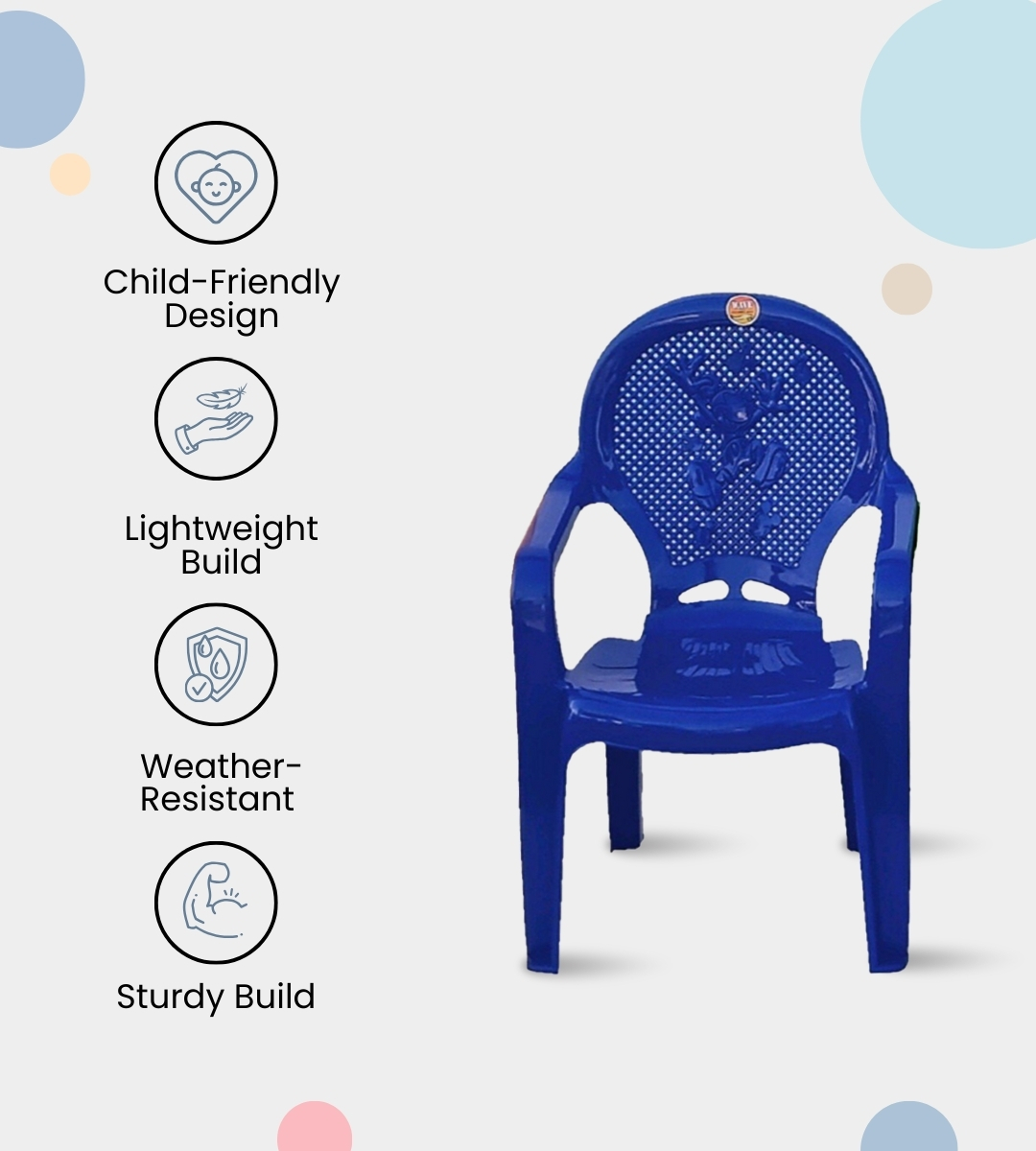 The WAVE 1ST BABY CHAIR is a durable, lightweight, and child-friendly seating option crafted from virgin quality heavy plastic. Its compact design with arms ensures both comfort and safety for kids. With a seat height of 12 inches and sturdy build, it is perfect for toddlers and young children in homes, kindergartens, play schools, and daycare centers.this chair brings joy and functionality to any space. Backed by a 1-year warranty, it is an affordable and reliable choice for everyday children’s seating needs.
