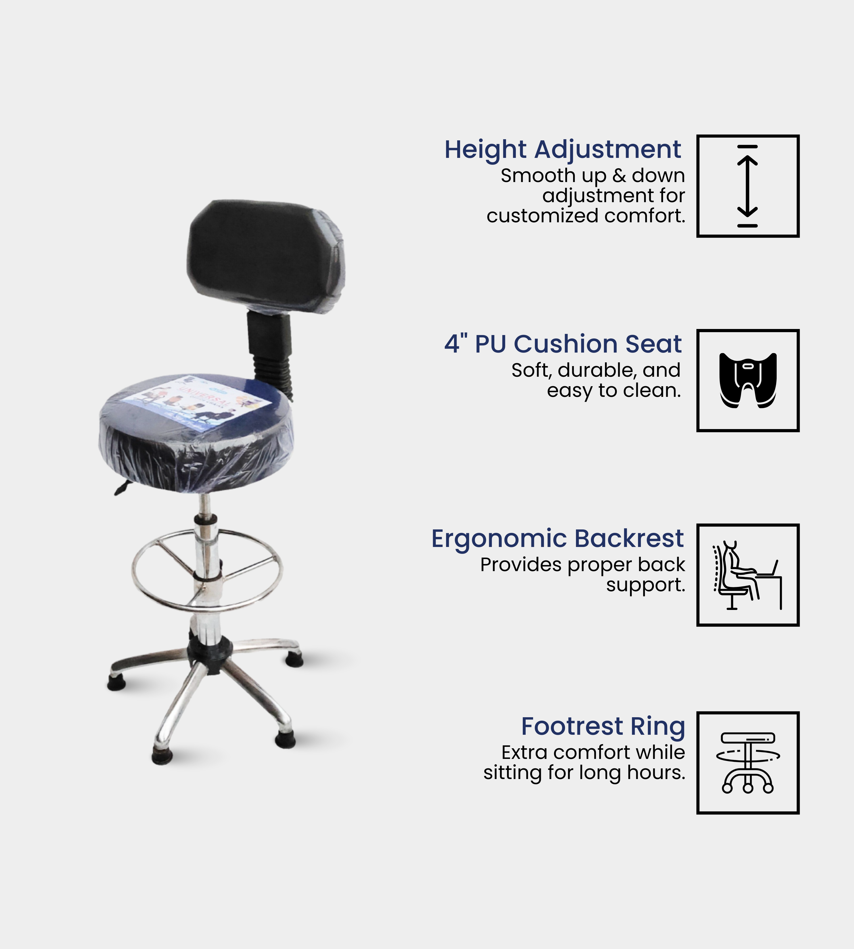 Built with a strong steel chrome base with adjusters/wheels, it offers excellent stability and mobility. Its compact design makes it perfect for clinics, hospitals, receptions, cafes, breakfast tables, and modern bar counters.