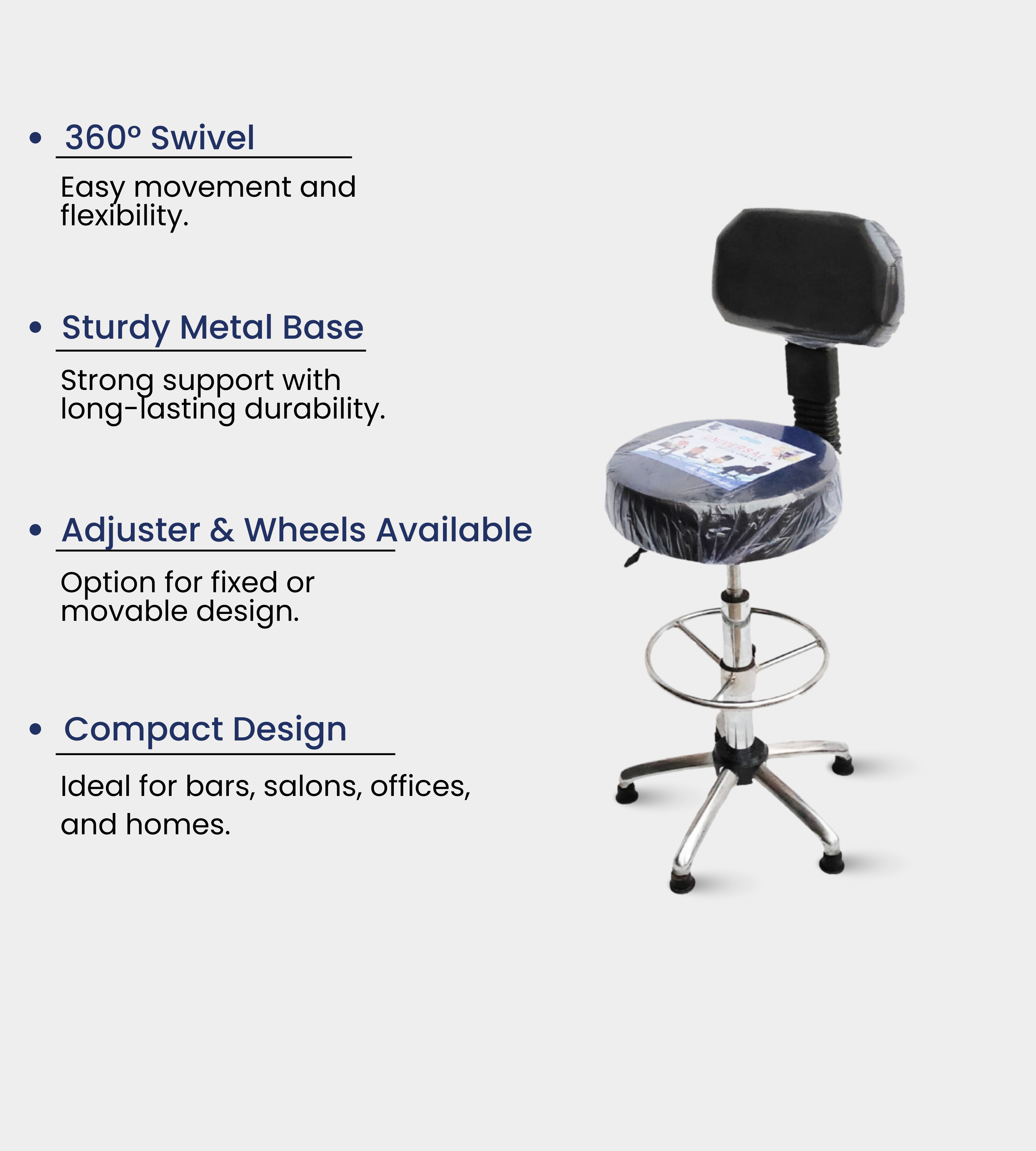 The Bar Stool (Without Arms) is a stylish, durable, and versatile seating solution designed for both professional and home environments. Featuring a rexene seat with push-back comfort, it comes with an adjustable height range of 26–34 inches, ensuring flexibility for different setups.