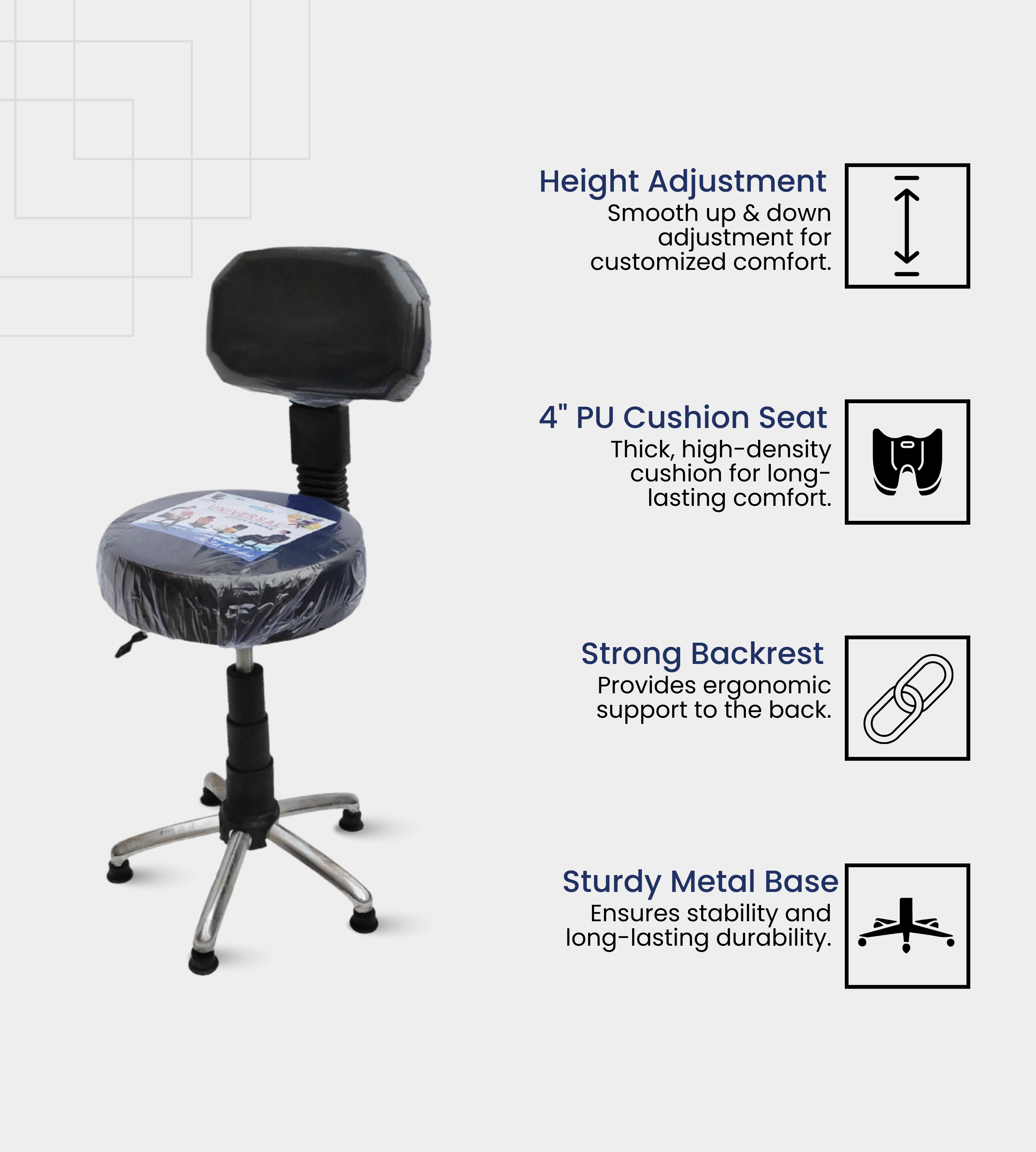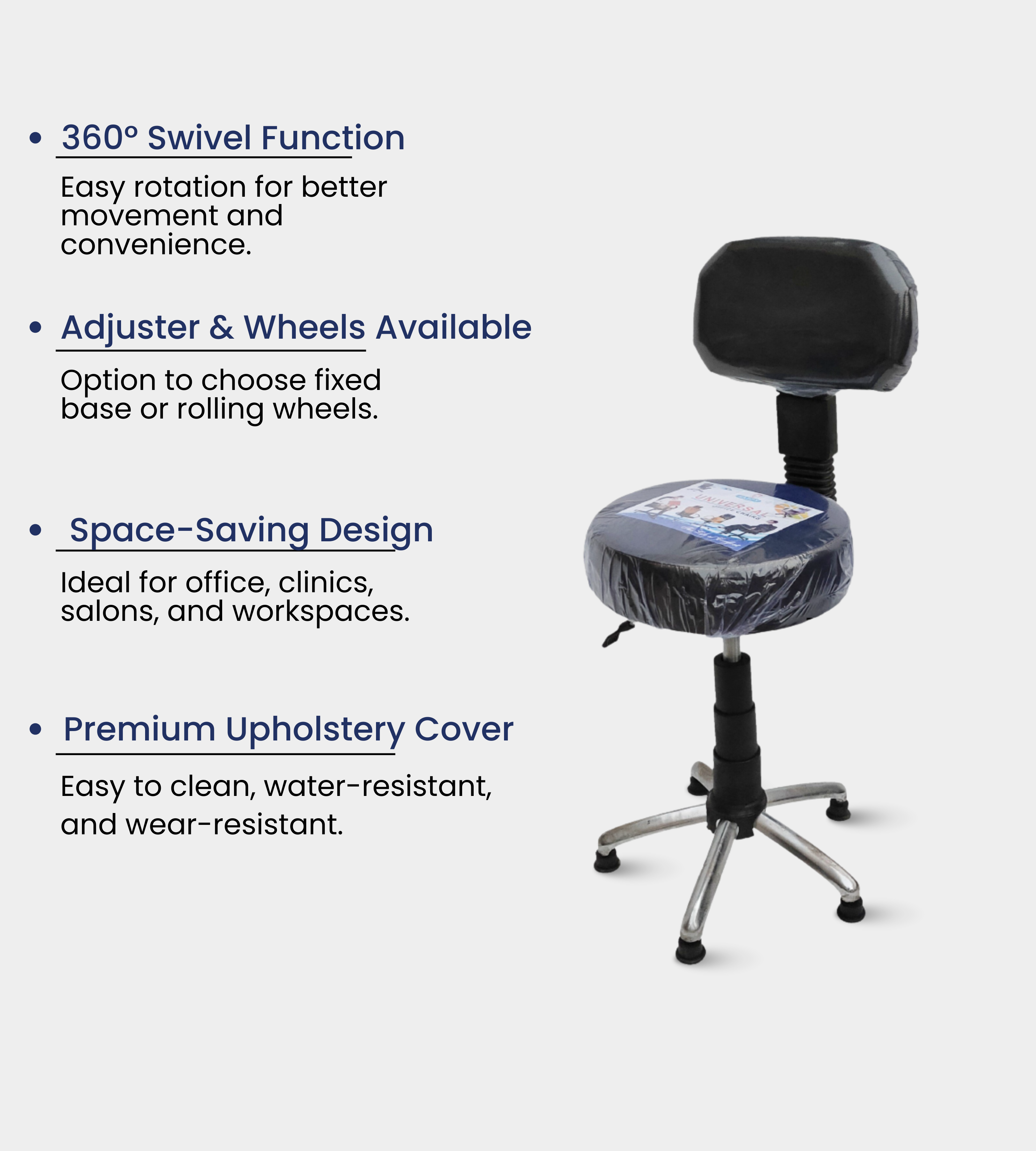 It features a padded rexene seat for comfort and a steel chrome base with adjusters/wheels, ensuring stability and easy movement. With its adjustable height (18–24 in), this stool adapts to multiple use cases—from hospitals, clinics, and receptions to home breakfast counters and offices.