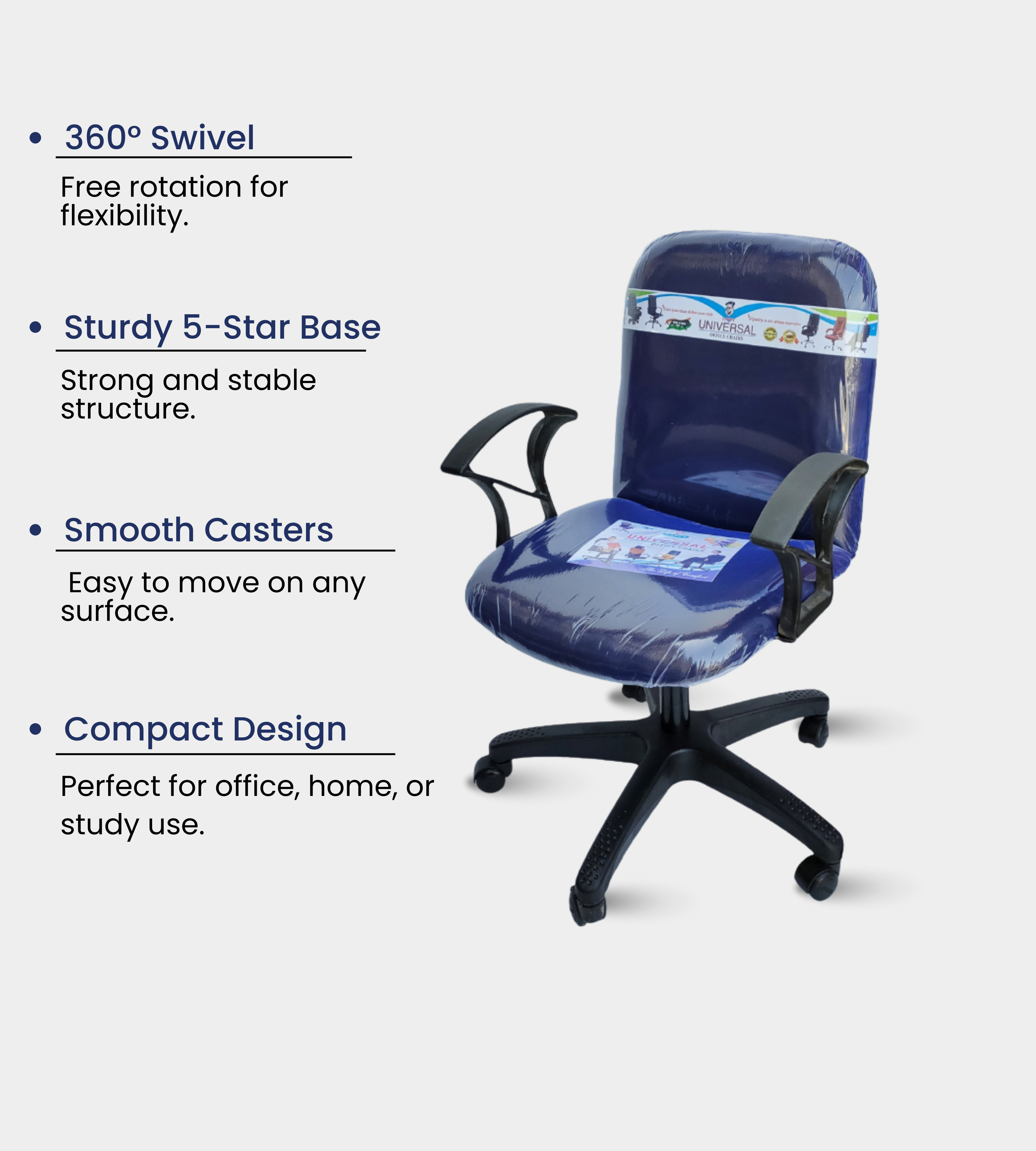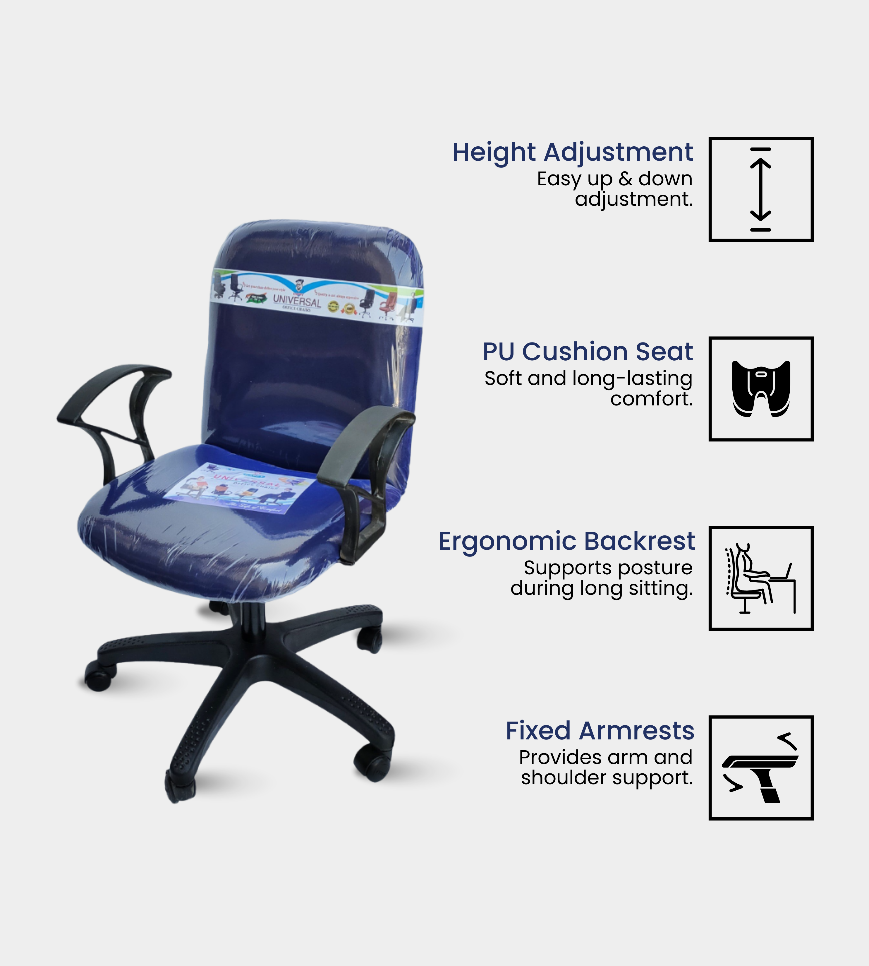 With a cloth-upholstered seat and backrest, a PVC plastic base, and a push-back system, it delivers comfort and reliability for daily sitting. The hard handles provide support, while the adjustable height (20–25 in) ensures flexibility.