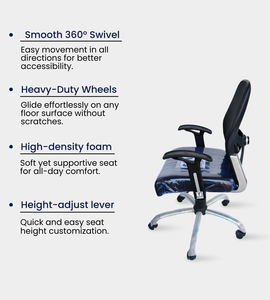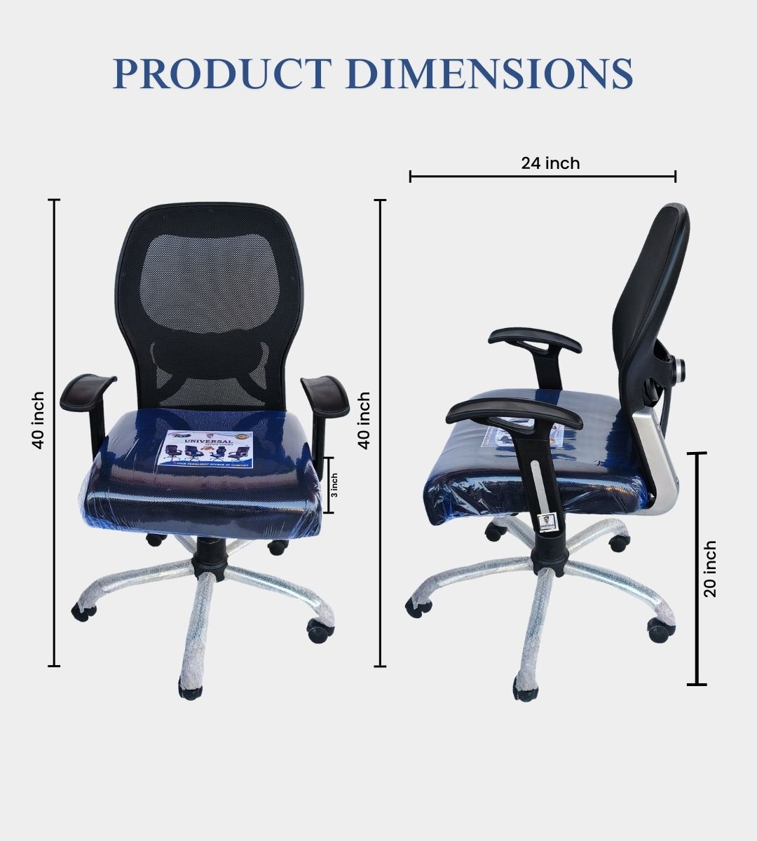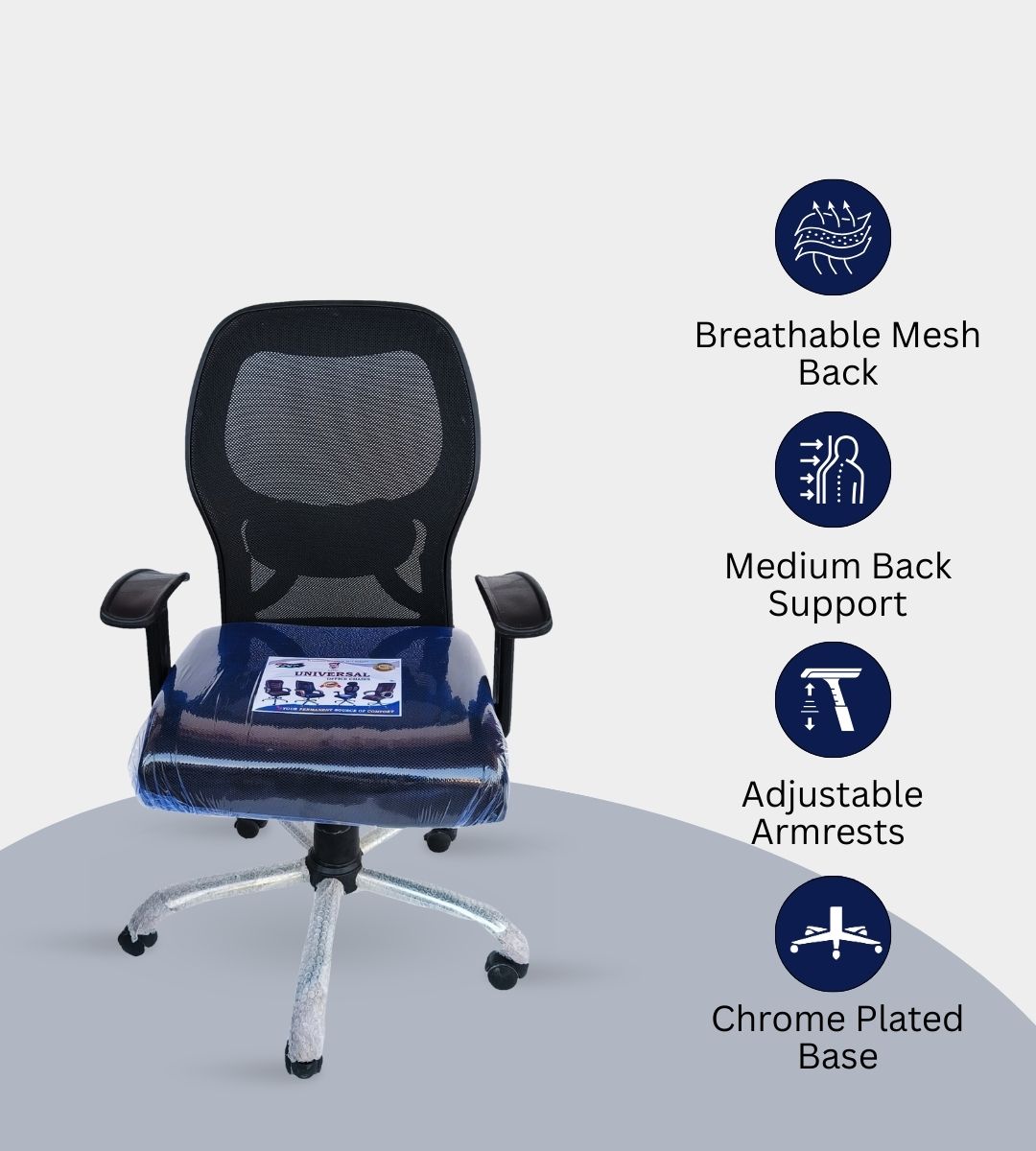 The NET MEDIUM BACK chair is a high-quality ergonomic solution for office and institutional seating. With a medium-height backrest made of heavy mesh fabric, it provides optimal support and breathability. Its imported chrome base, height adjustment (19–24 inches), and tilting system with locking ensure flexibility and durability. Available with hard or soft handles, this chair is perfect for staff, clients, and executives who value comfort and professional appeal.