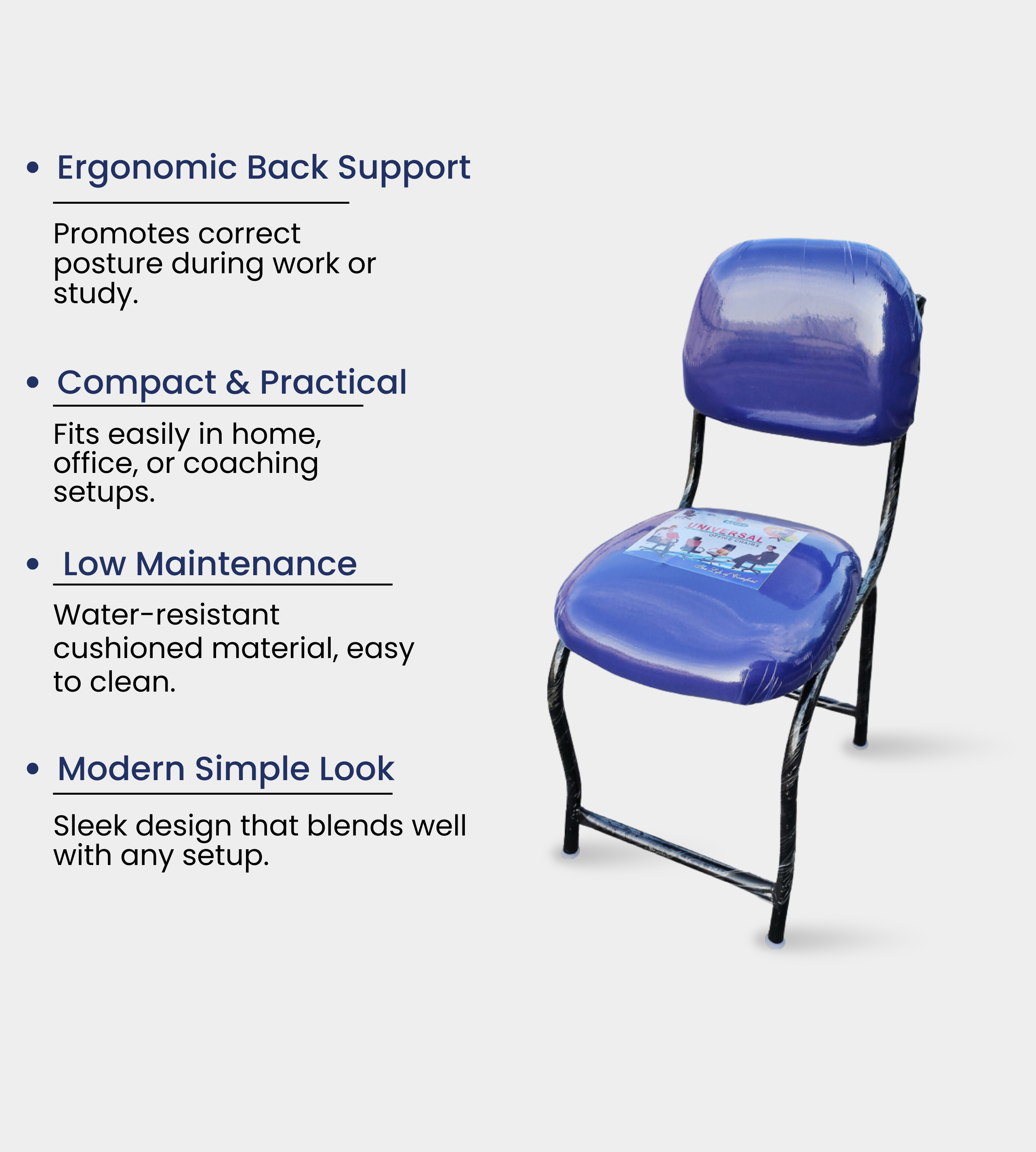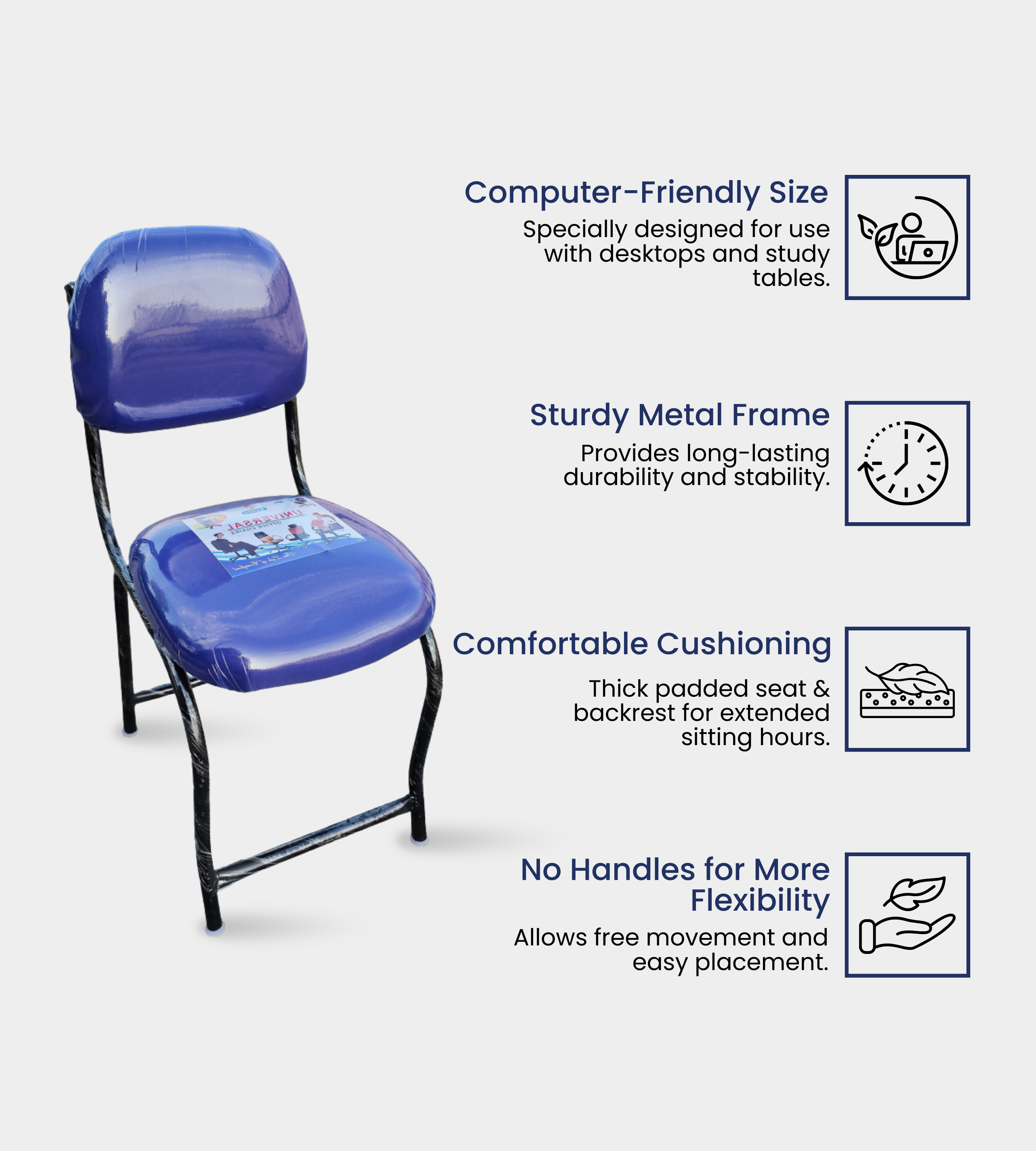 The FIX CHAIR COMPUTER SIZE (WITHOUT HANDLES) is a compact and durable seating option ideal for educational and professional use. Made with a sturdy round pipe frame and a cushioned cloth seat, it ensures comfort and long-lasting performance. With a seat height of 22 inches and ergonomic proportions, it is suitable for computer desks, study areas, and classrooms. Designed without handles, it offers a space-saving and affordable solution for institutions. This chair is perfect for schools, colleges, libraries, coaching centers, and staff rooms where reliable daily seating is required.