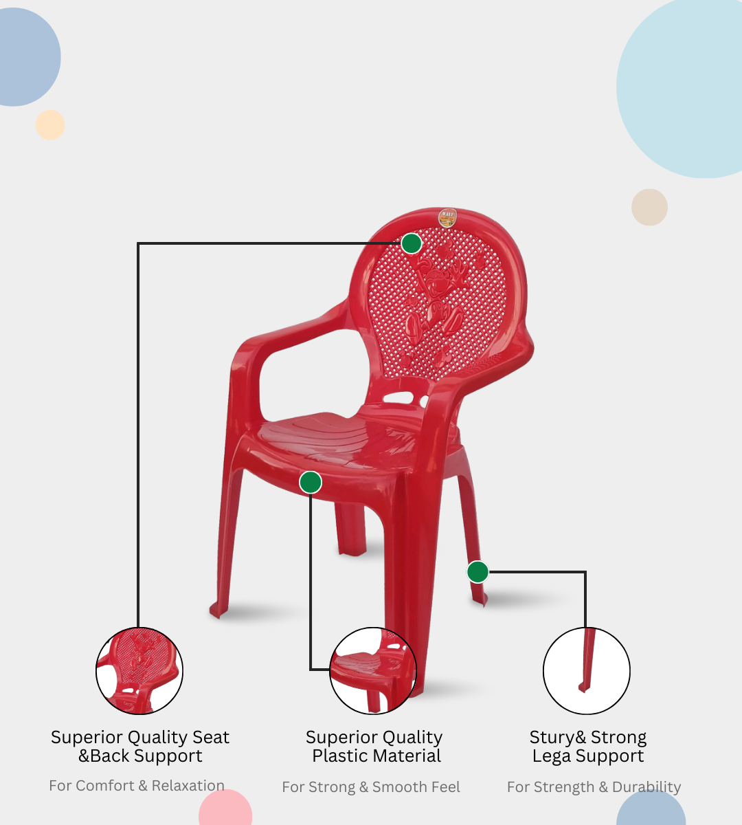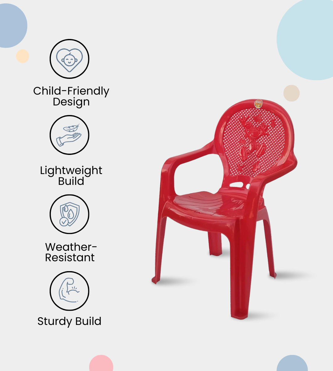 The WAVE 1ST BABY CHAIR is a durable, lightweight, and child-friendly seating option crafted from virgin quality heavy plastic. Its compact design with arms ensures both comfort and safety for kids. With a seat height of 12 inches and sturdy build, it is perfect for toddlers and young children in homes, kindergartens, play schools, and daycare centers.this chair brings joy and functionality to any space. Backed by a 1-year warranty, it is an affordable and reliable choice for everyday children’s seating needs.