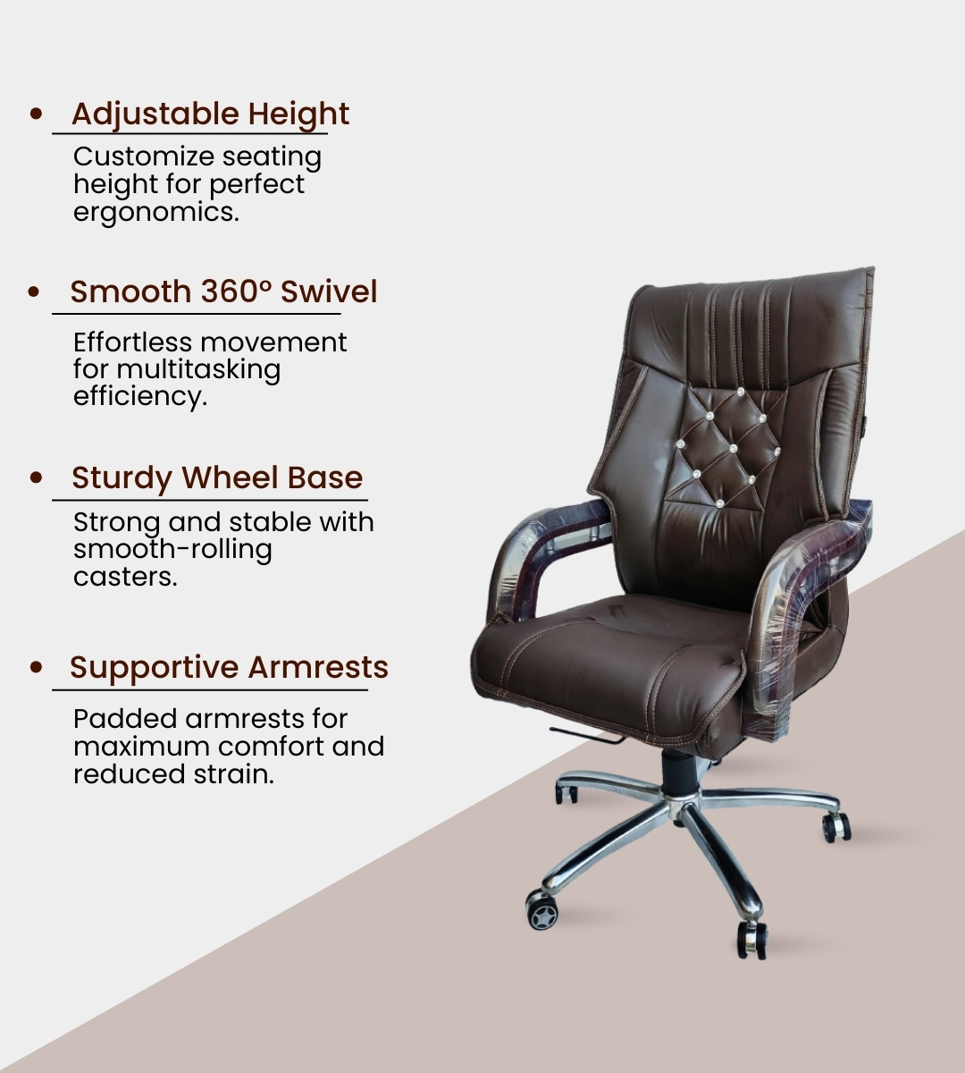 Its imported steel chrome base and alloy wheels provide strength and effortless mobility. The tilting mechanism with locking system and adjustable height (20–25 in) ensure ergonomic seating for long hours. The wooden foam-padded rexene handles add a touch of class and comfort.