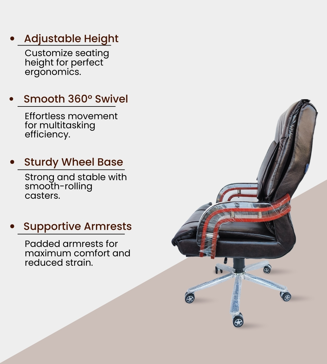 Its imported steel chrome base and alloy wheels provide strength and effortless mobility. The tilting mechanism with locking system and adjustable height (20–25 in) ensure ergonomic seating for long hours. The wooden foam-padded rexene handles add a touch of class and comfort.