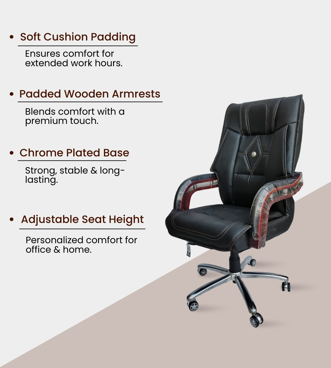 Its imported steel chrome base and alloy wheels provide strength and effortless mobility. The tilting mechanism with locking system and adjustable height (20–25 in) ensure ergonomic seating for long hours. The wooden foam-padded rexene handles add a touch of class and comfort.