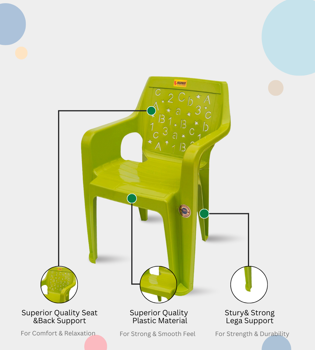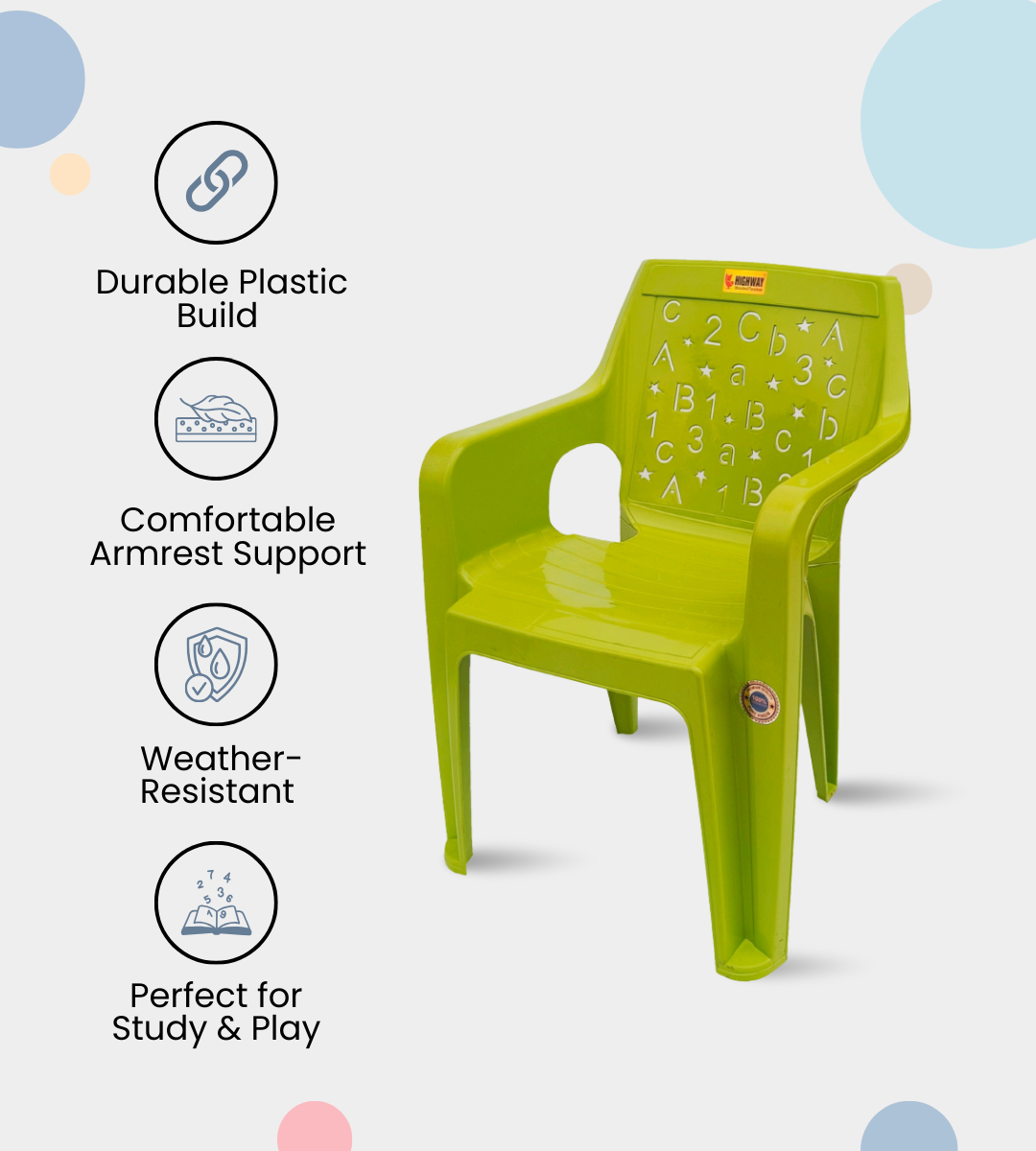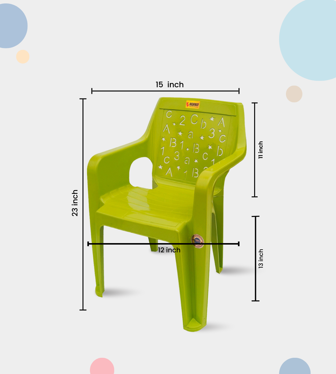 The ABCD BABY CHAIR is a durable and child-friendly seating solution designed for kids’ comfort and safety. Made from virgin quality heavy-duty plastic, it ensures strength and long-lasting use.