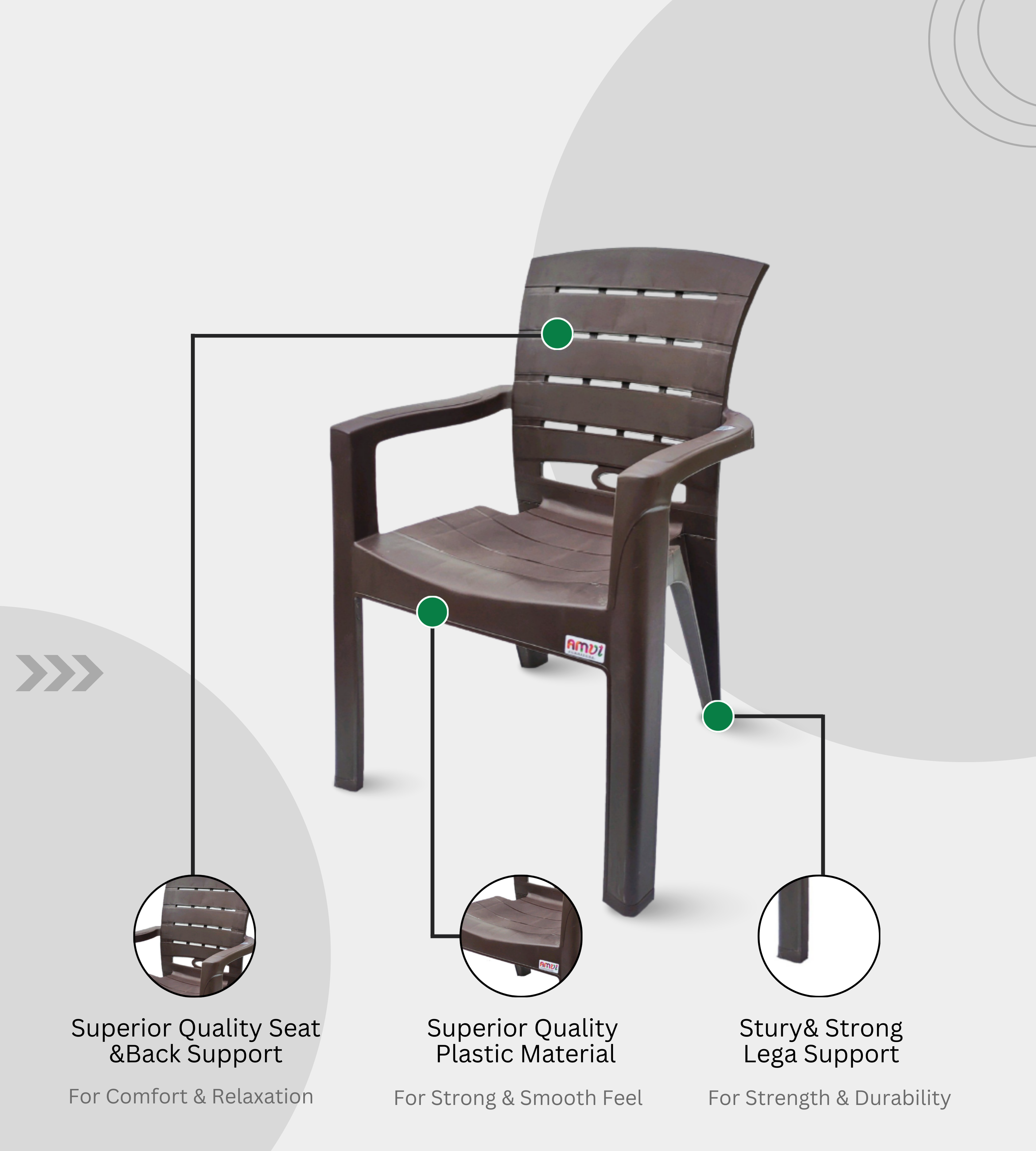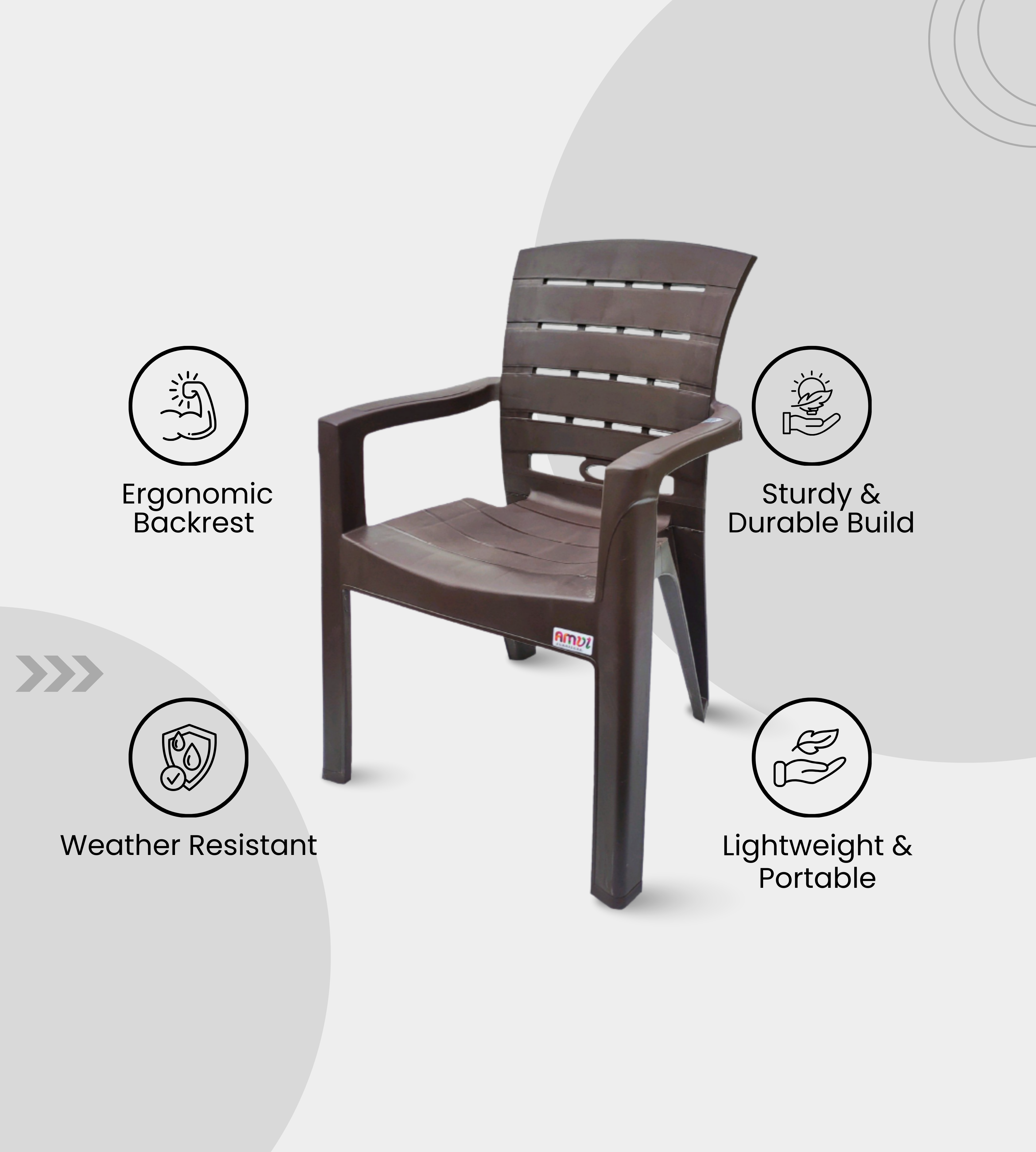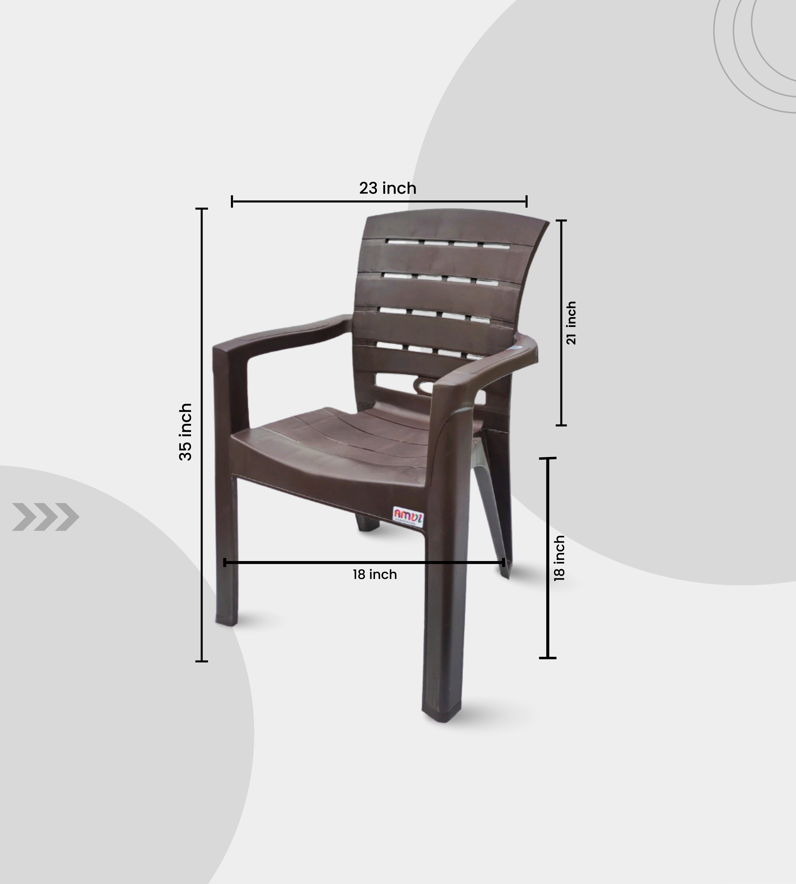 The TITAN (AMUL) Chair is a premium heavy-duty plastic armchair built for durability and elegance. Crafted in feather brown finish, it features a 35-inch height, 23-inch seat width, and a 21-inch supportive backrest for superior comfort.