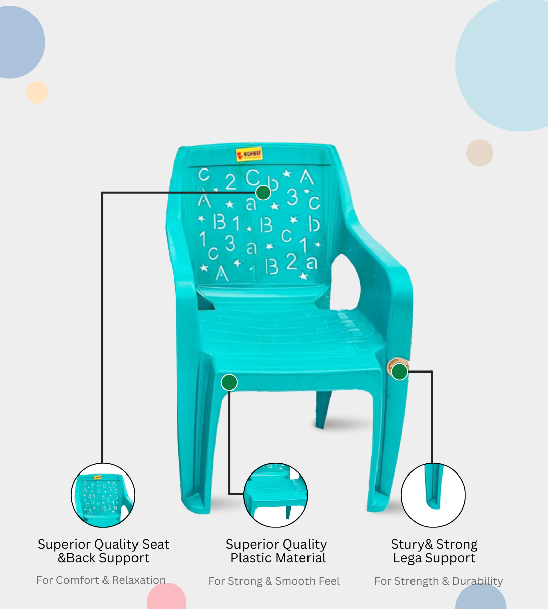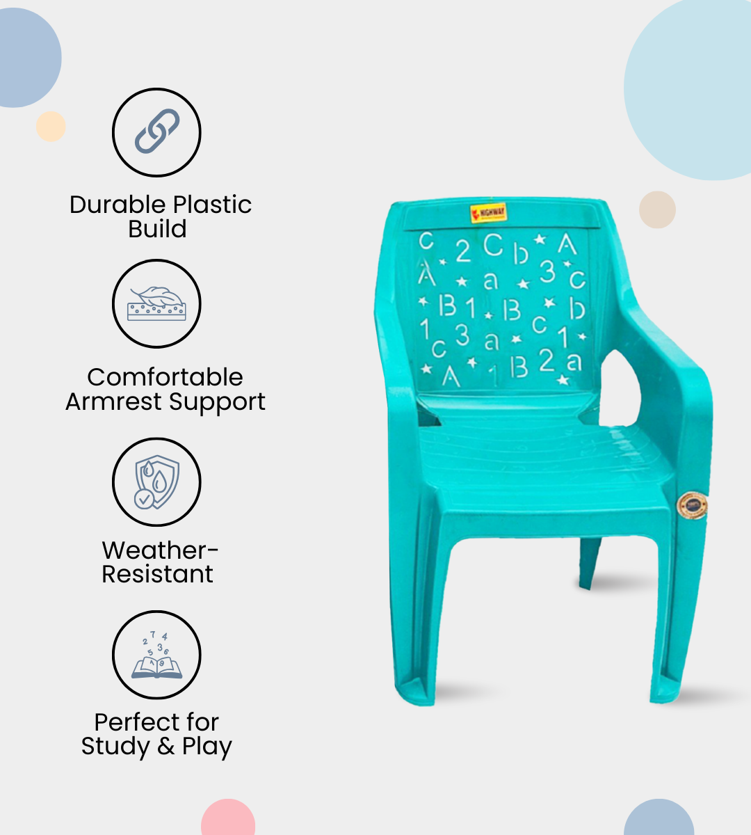 The ABCD BABY CHAIR is a durable and child-friendly seating solution designed for both comfort and safety. Crafted from virgin quality heavy-duty plastic, it ensures strength and long-lasting performance.