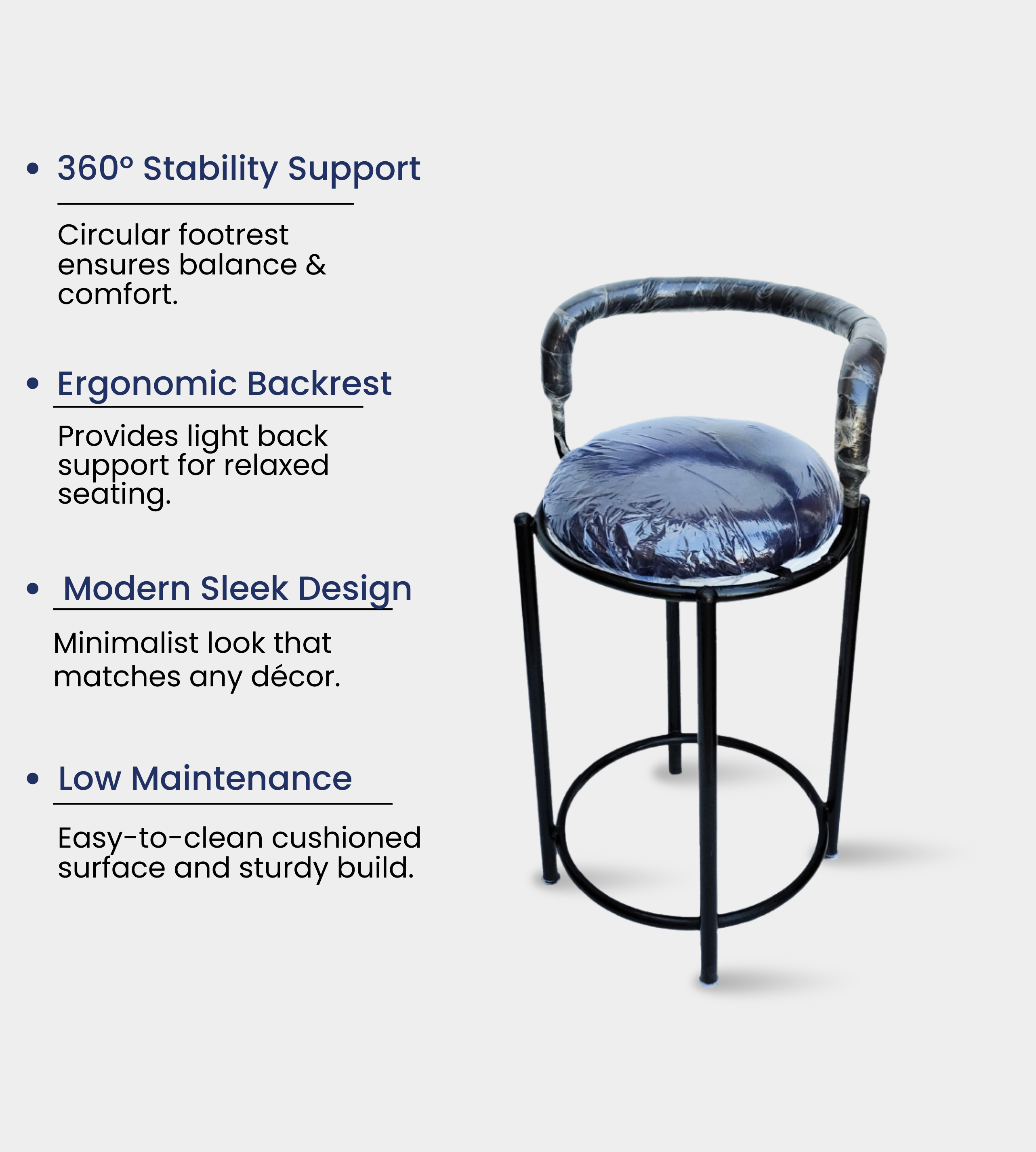 The Fix Stool (24 Inches) is a durable and practical seating option for institutions, schools, and coaching centers. Built with a sturdy round pipe frame and a cushioned cloth seat and backrest, it ensures both stability and comfort.