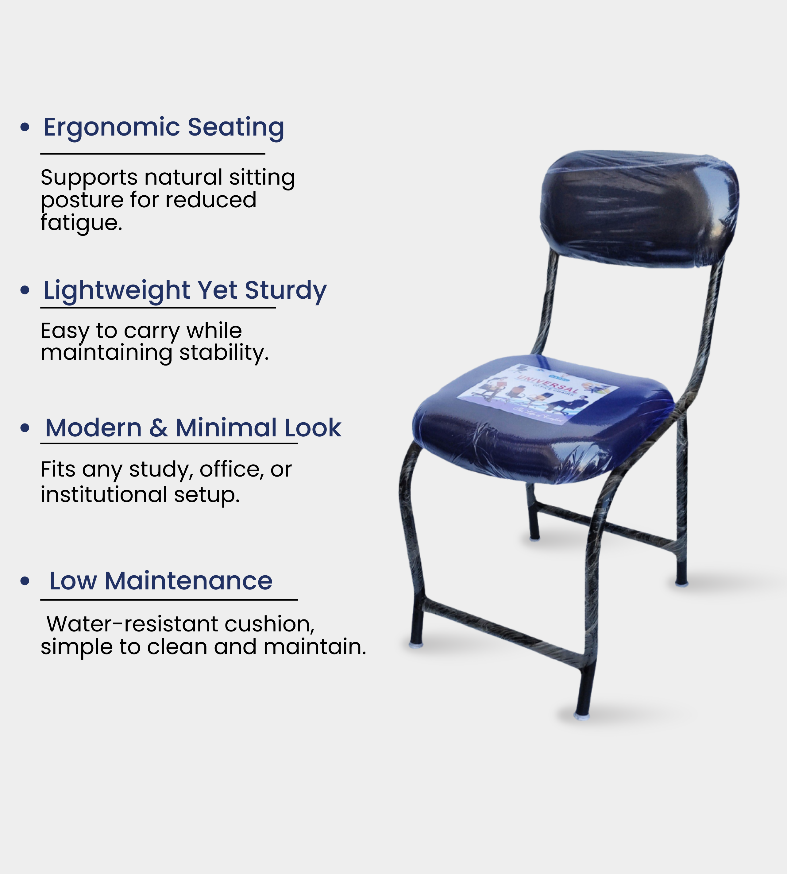 Available in multiple colours, this chair combines affordability, style, and durability, making it ideal for daily heavy use in educational and professional environments.